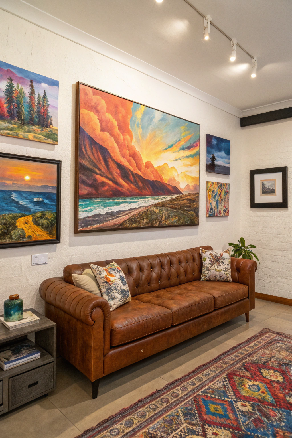 Elevate your living room’s style by introducing striking artwork that contrasts with your brown leather sofa. Opt for vibrant abstract paintings or colorful landscapes to create focal points. Large-scale canvases can command attention, while a curated gallery wall of smaller pieces adds depth and intrigue. Don’t hesitate to blend different artistic styles to reflect your unique taste.