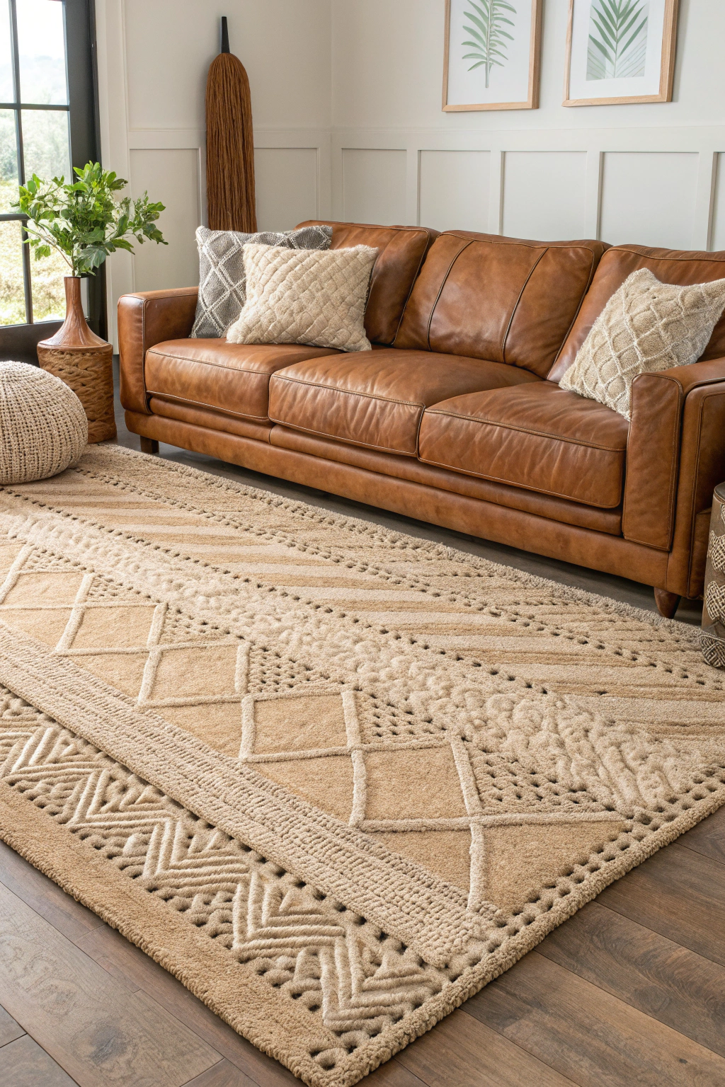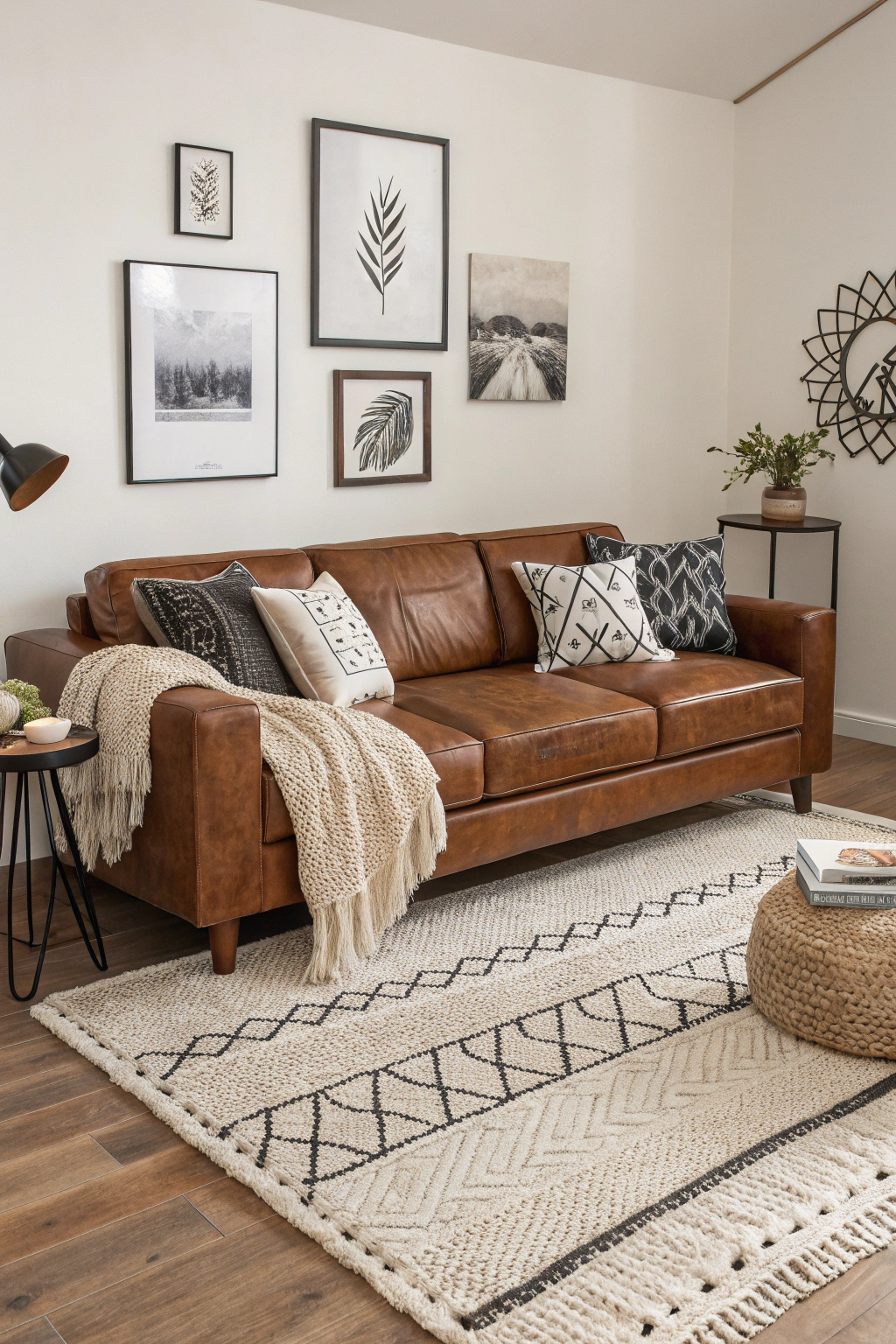 Layering rugs adds dimension and warmth to your living area, perfectly complementing a brown leather sofa. When selecting rugs, keep these pointers in mind:
