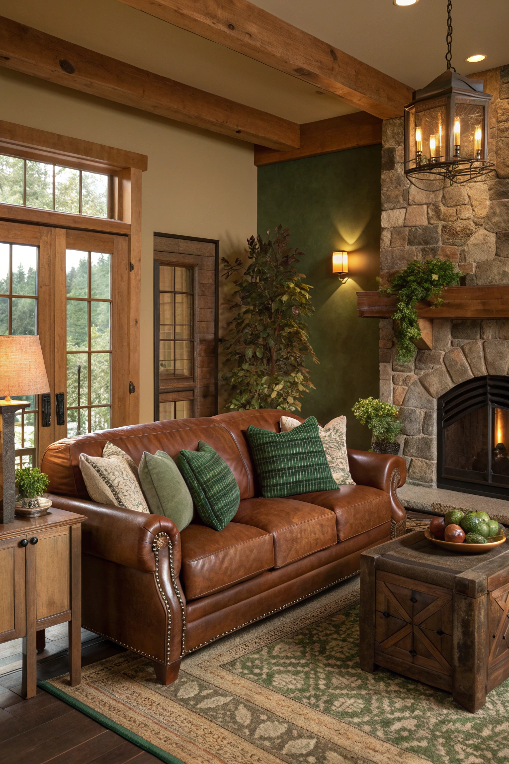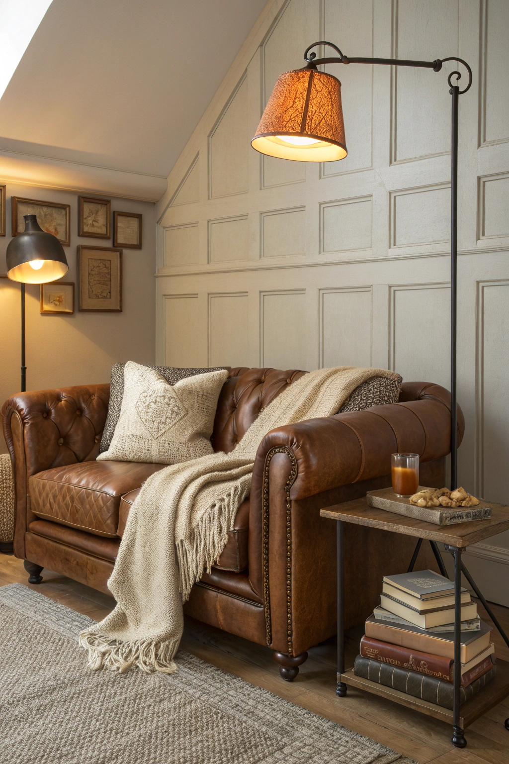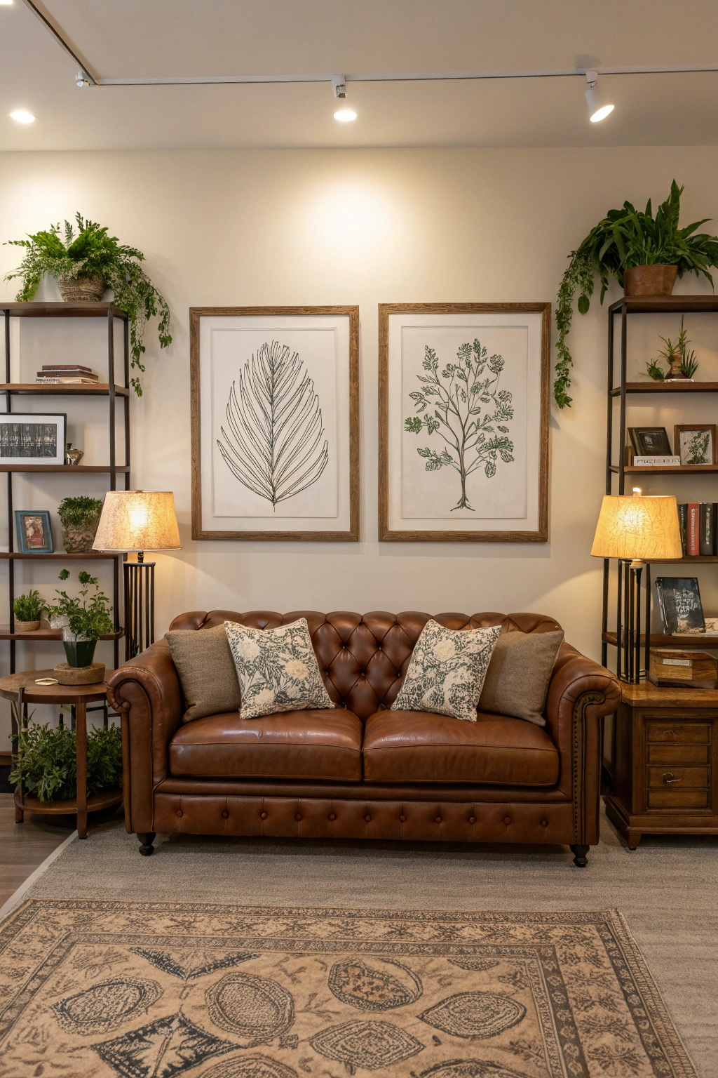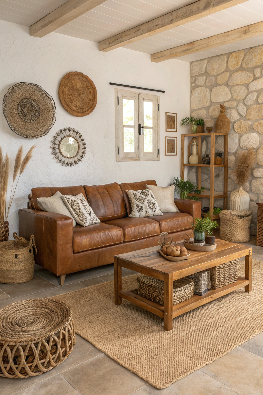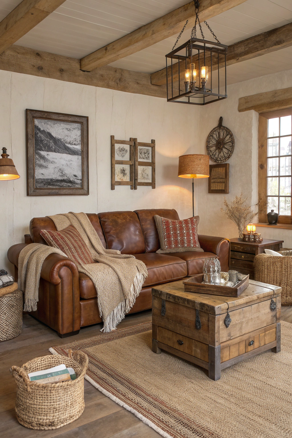 Rustic décor elements add warmth and personality that pair beautifully with a brown leather sofa. To achieve this aesthetic, consider incorporating: