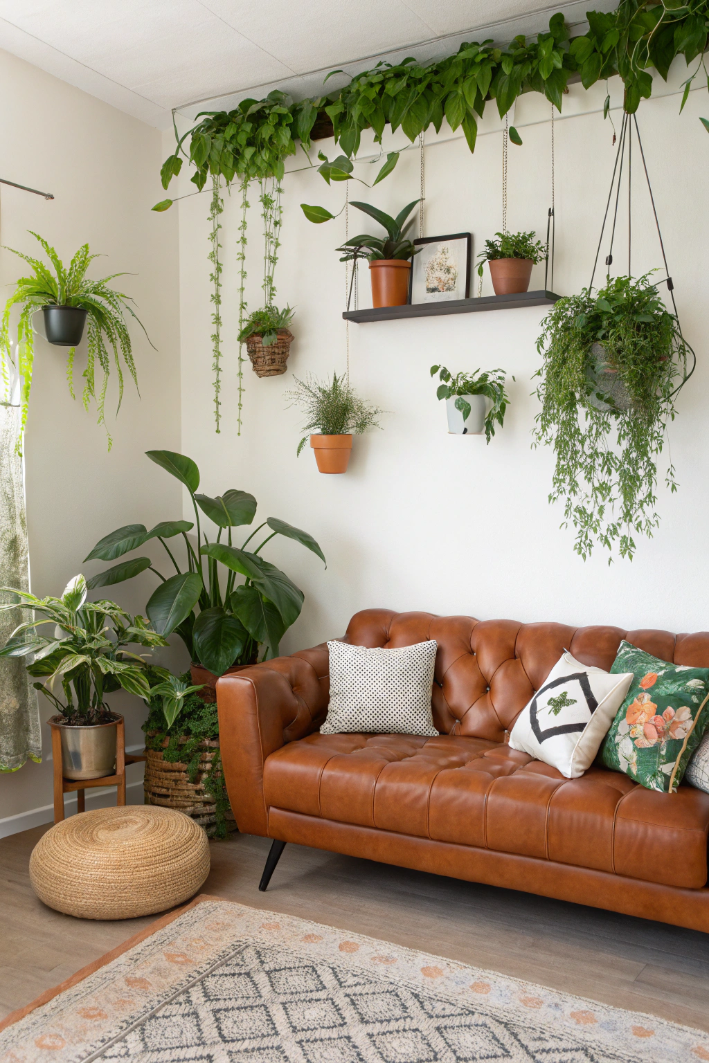 Adding plants breathes life into your living room, especially alongside a brown leather sofa. Popular options like snake plants, pothos, or fiddle leaf figs bring freshness and vitality. Utilize hanging planters or wall-mounted greenery to save floor space while adding visual interest. Even a simple arrangement of fresh flowers in a vase can brighten the room and create a welcoming vibe.