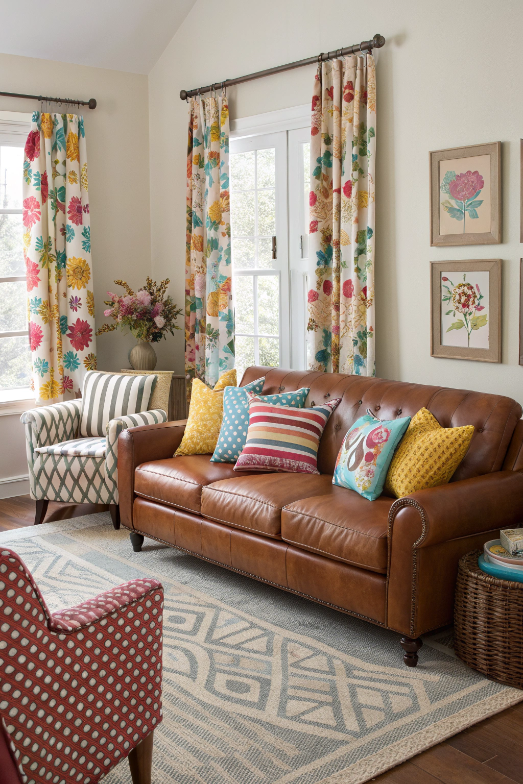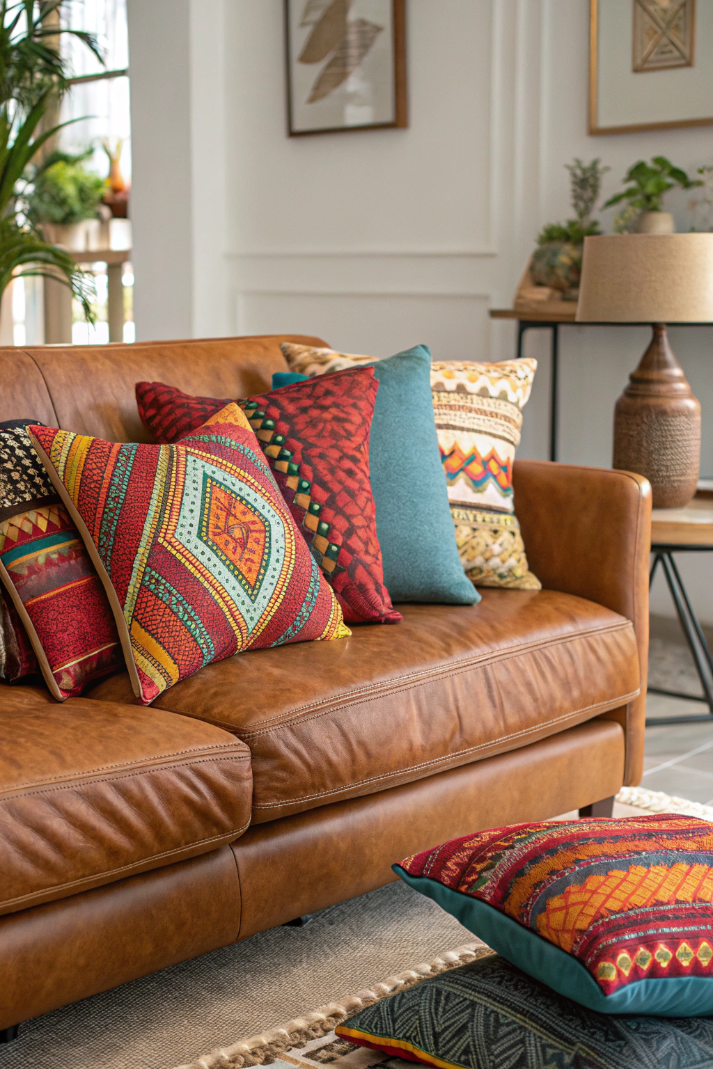Mixing diverse patterns adds vibrancy and depth to your living space, especially when anchored by a brown leather sofa. Experiment with combinations such as: