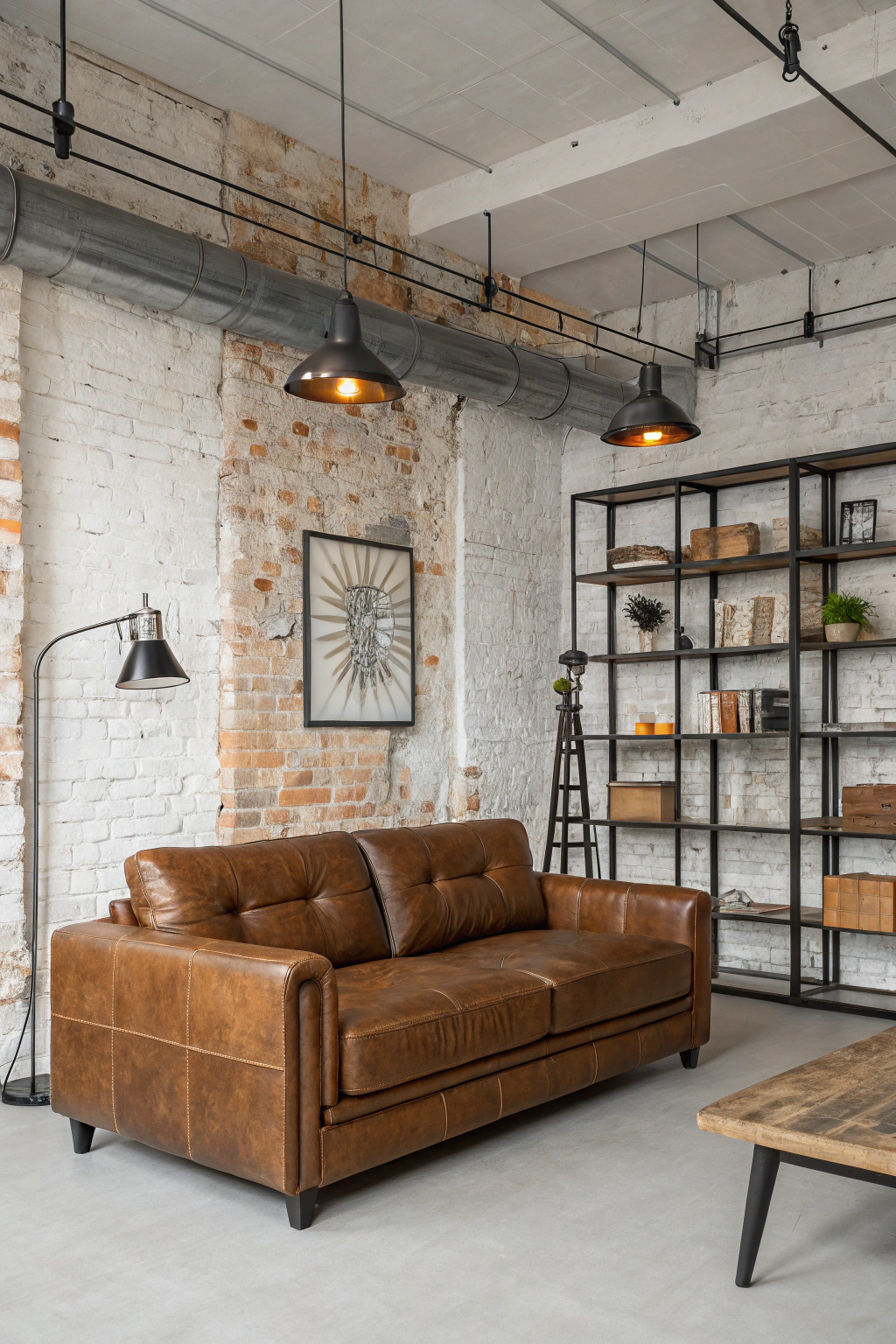 Highlight your brown leather sofa by embracing an industrial aesthetic. Exposed brick walls, metal shelving, and rugged wooden furniture create a raw, urban vibe. Use minimalist décor and neutral tones to keep the focus on the sofa while enhancing the room’s edgy character. Industrial-style lighting fixtures add the perfect finishing touch.