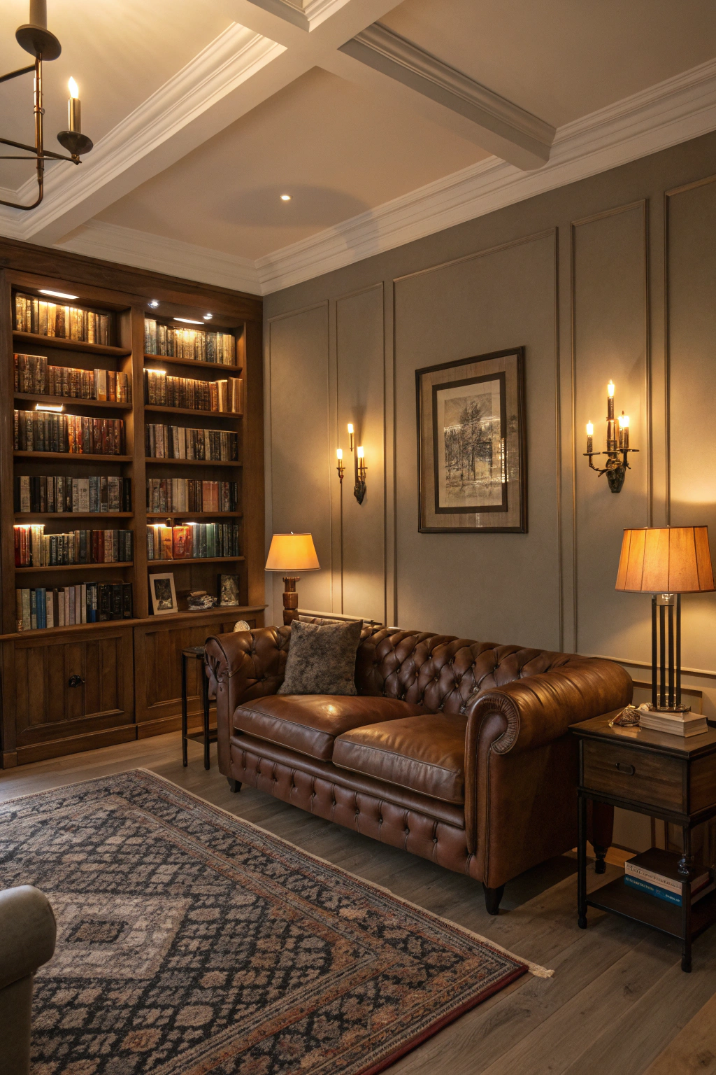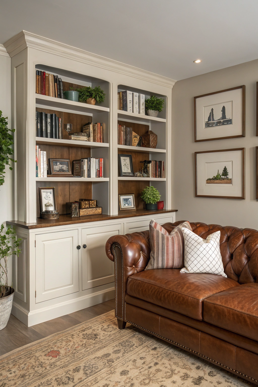 Bookshelves offer more than storage-they can be a key design element when paired with a brown leather sofa. To style them effectively: