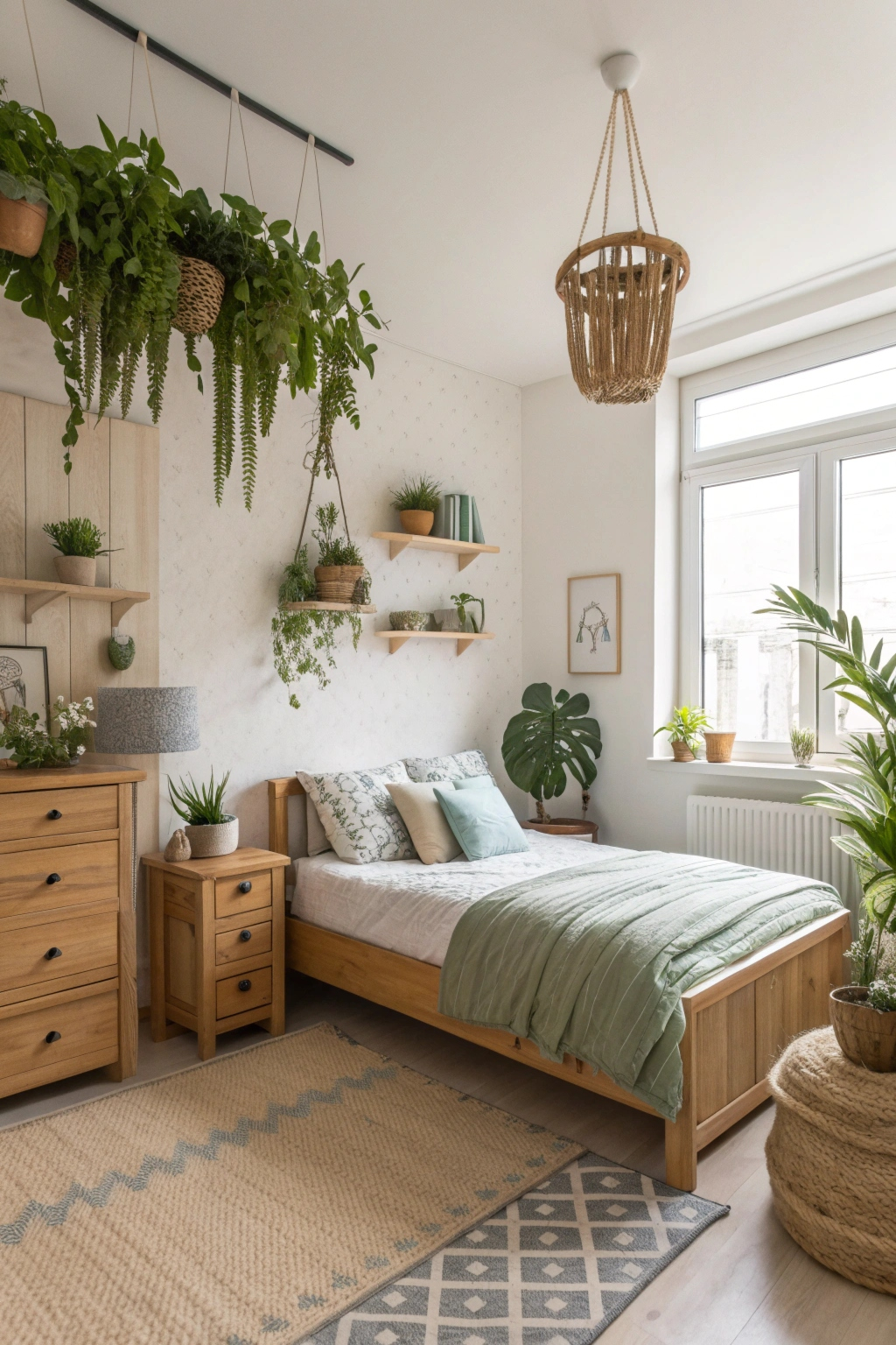 Infusing natural elements into the bedroom creates a soothing and refreshing environment. Incorporate greenery through potted plants or hanging planters, and choose wooden furniture or accents for warmth. Earth-toned walls and bedding complete the look, fostering a peaceful retreat that encourages relaxation and focus.