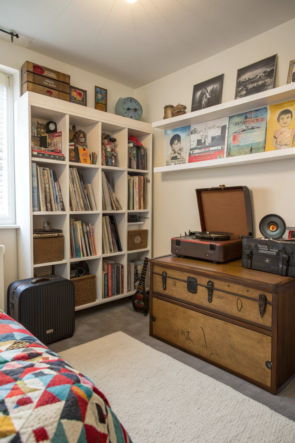 Showcasing a vintage collection adds charm and individuality to the room. Use stylish shelving or shadow boxes to display retro toys, classic books, or vinyl records. An antique trunk or suitcase can serve as both storage and decor. Encouraging your teen to curate their collection fosters a sense of pride and personal connection to their space.