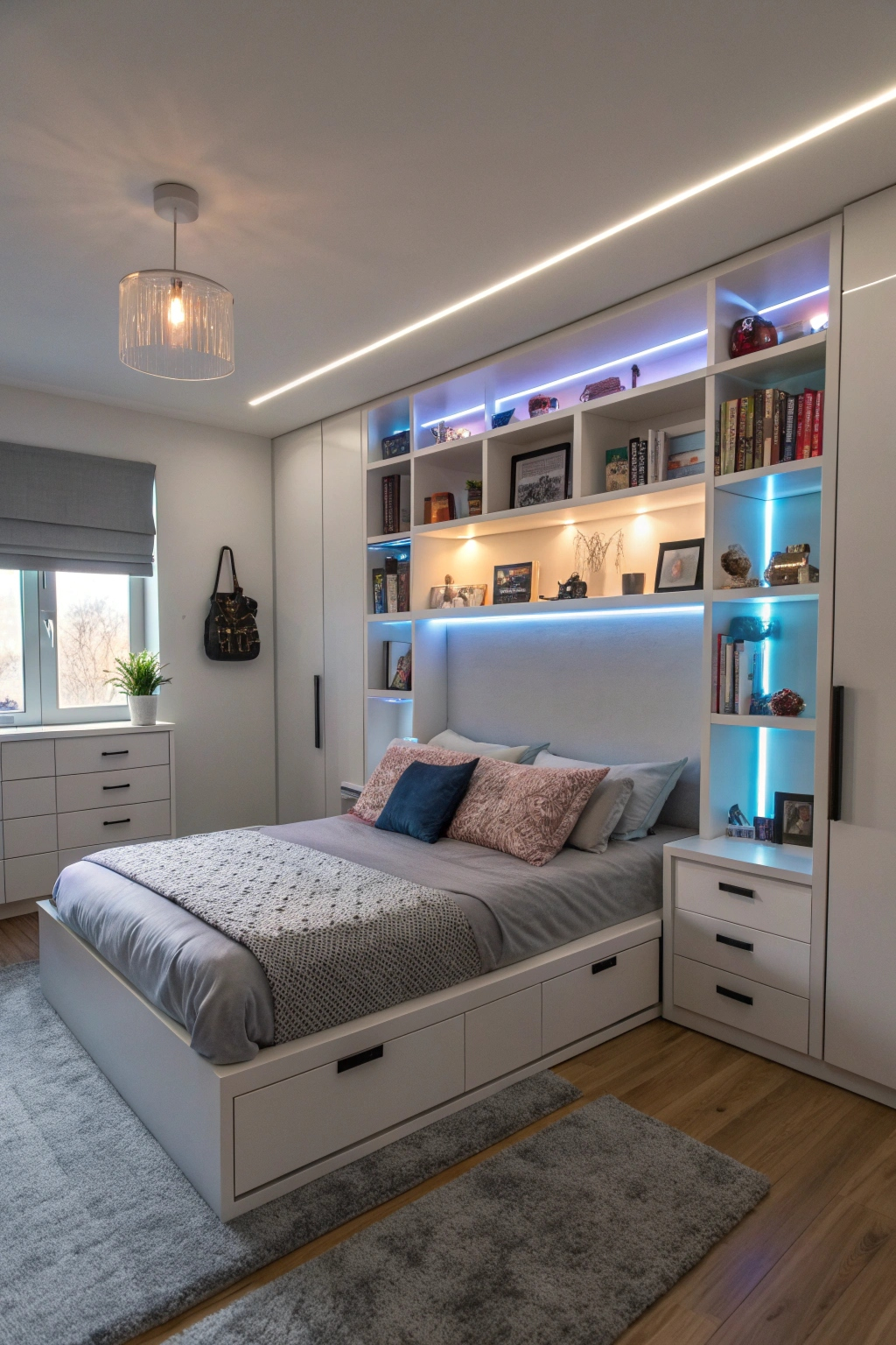 - LED strip lights to highlight shelves or bed frames for a contemporary feel.