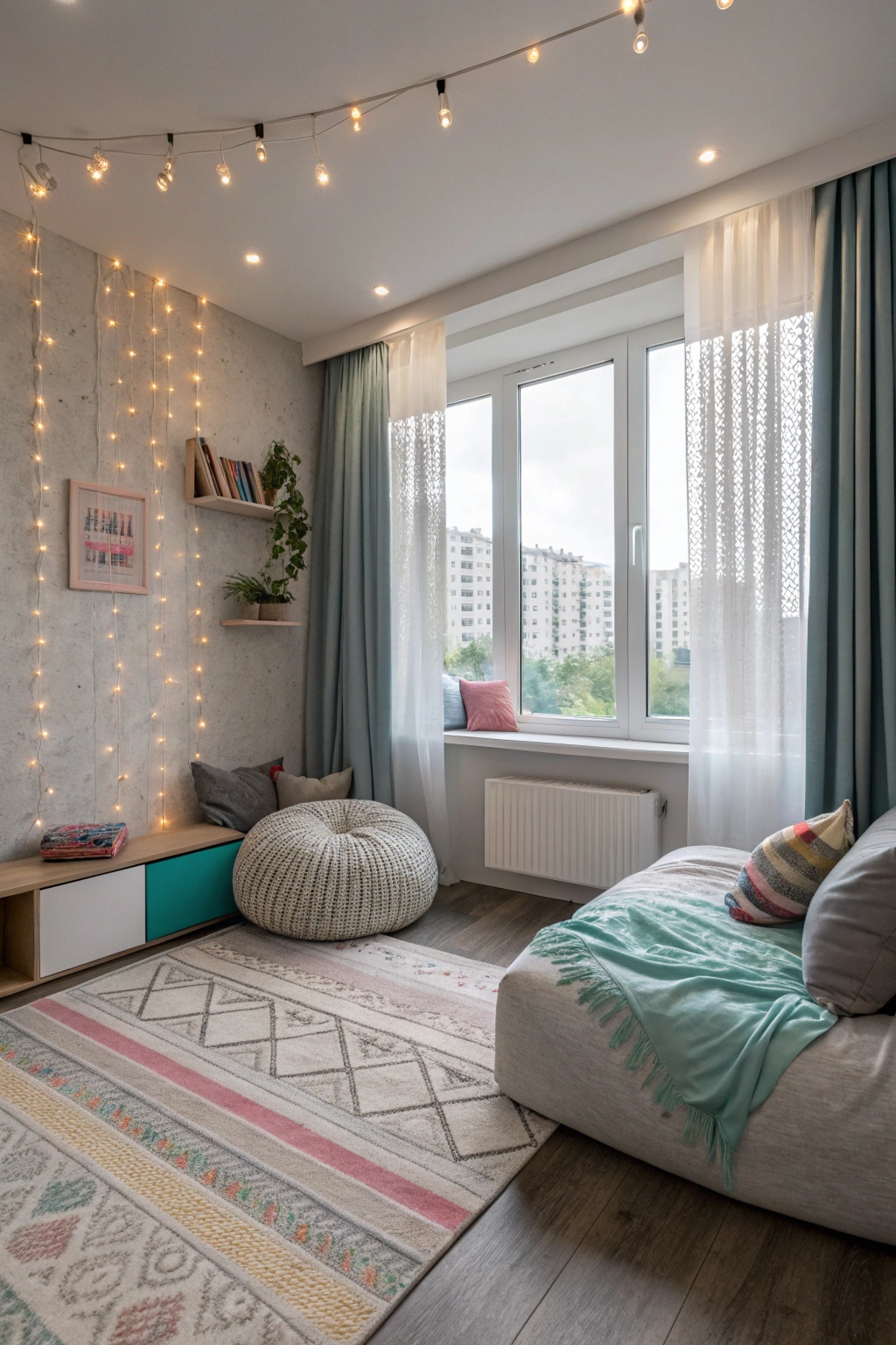 - Sheer curtains adorned with string lights for a whimsical glow.