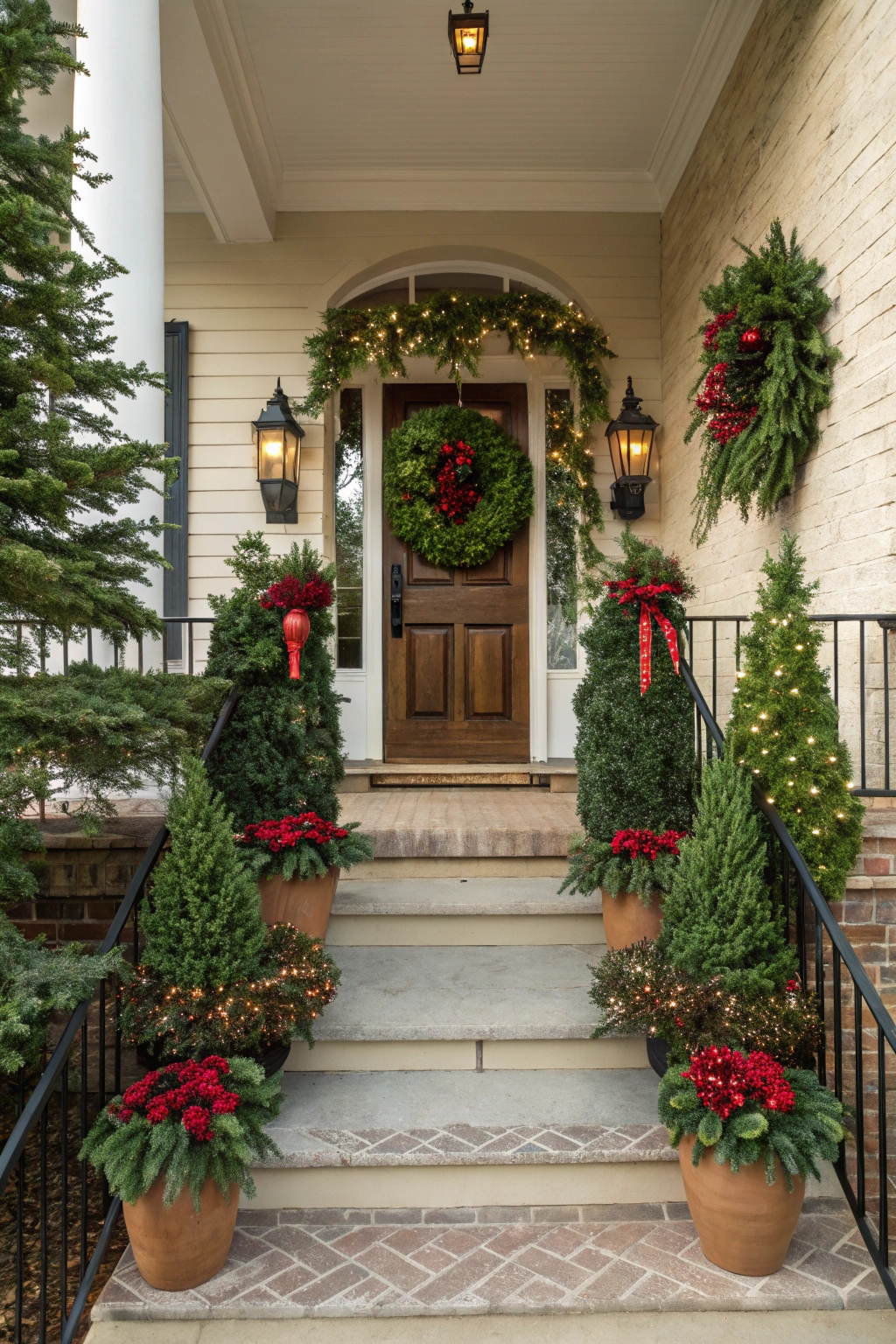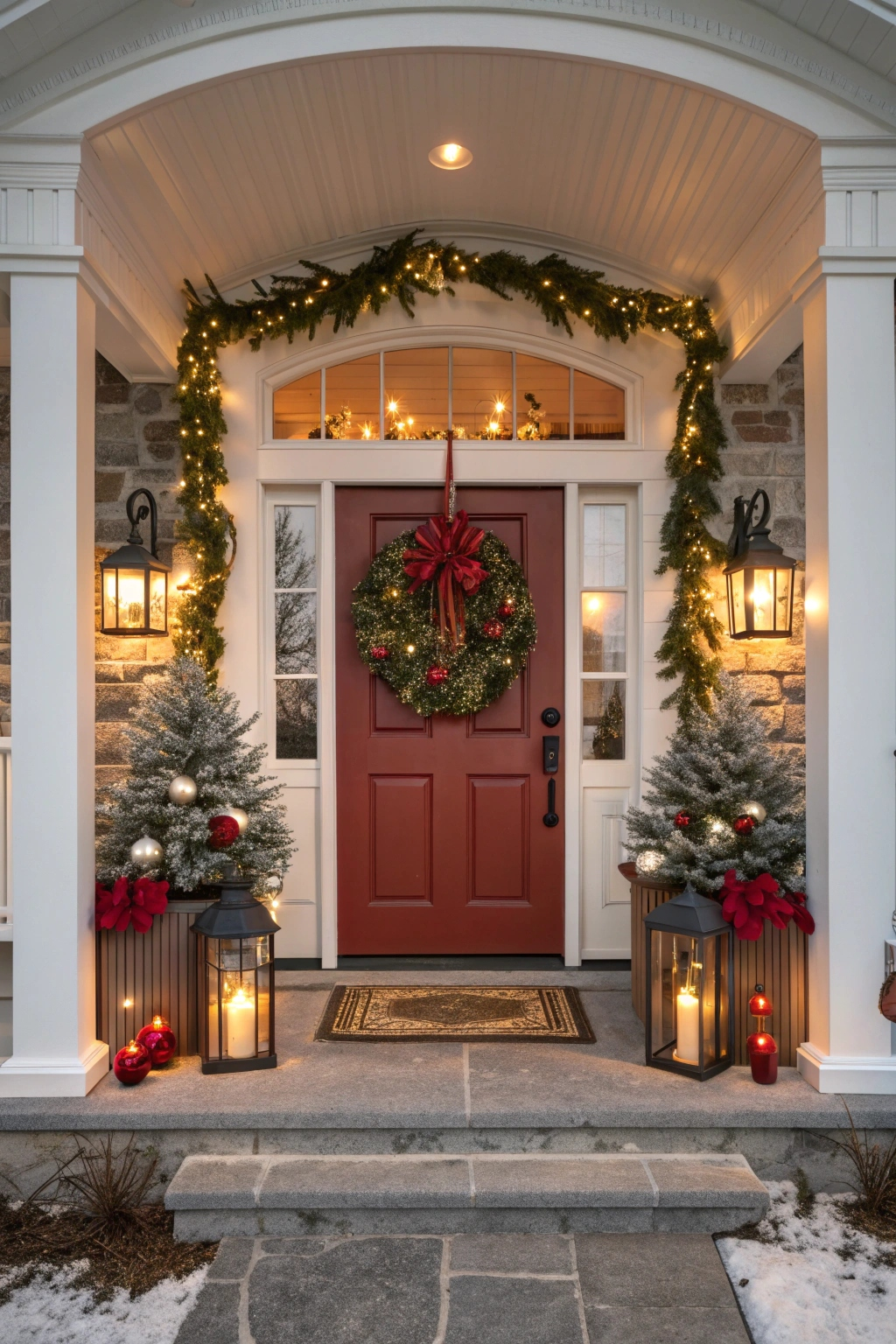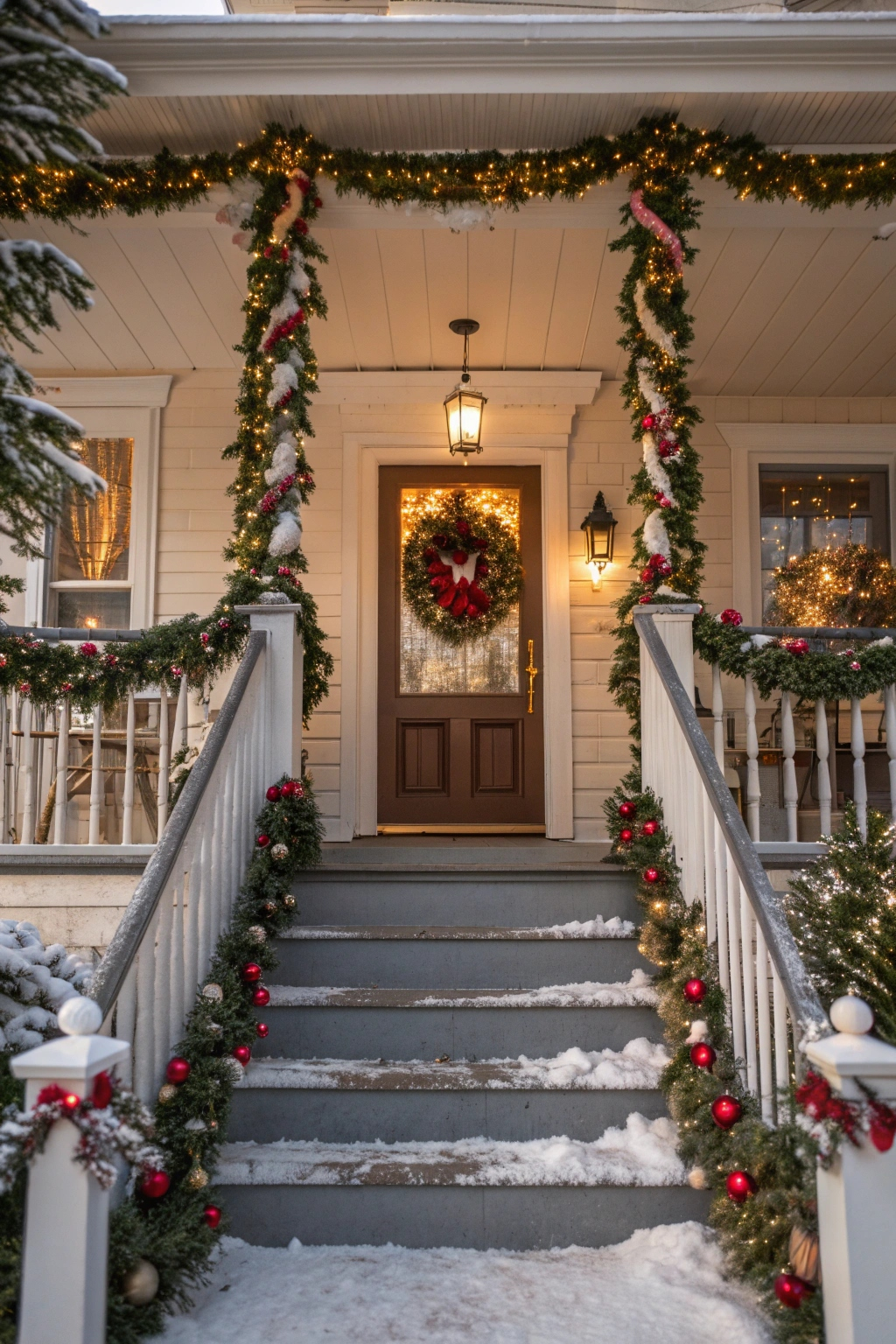 Complement your wreath with verdant garlands to amplify the holiday cheer. Choose from traditional pine, glittering metallic strands, or vibrant hues that coordinate with your overall theme. Drape garlands along railings, door frames, or across the porch ceiling. Embellish with festive touches like berries, ornaments, or twinkling lights to craft a magical winter scene.