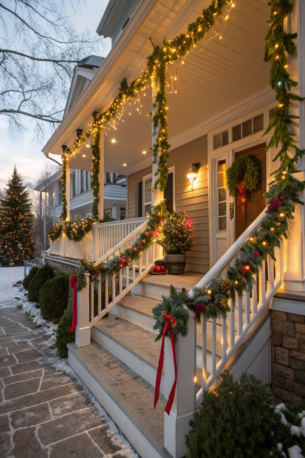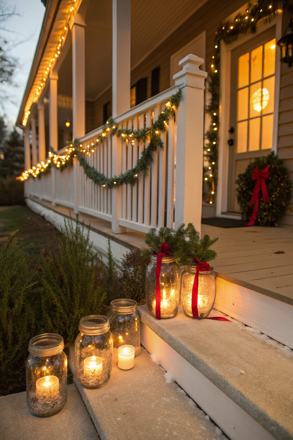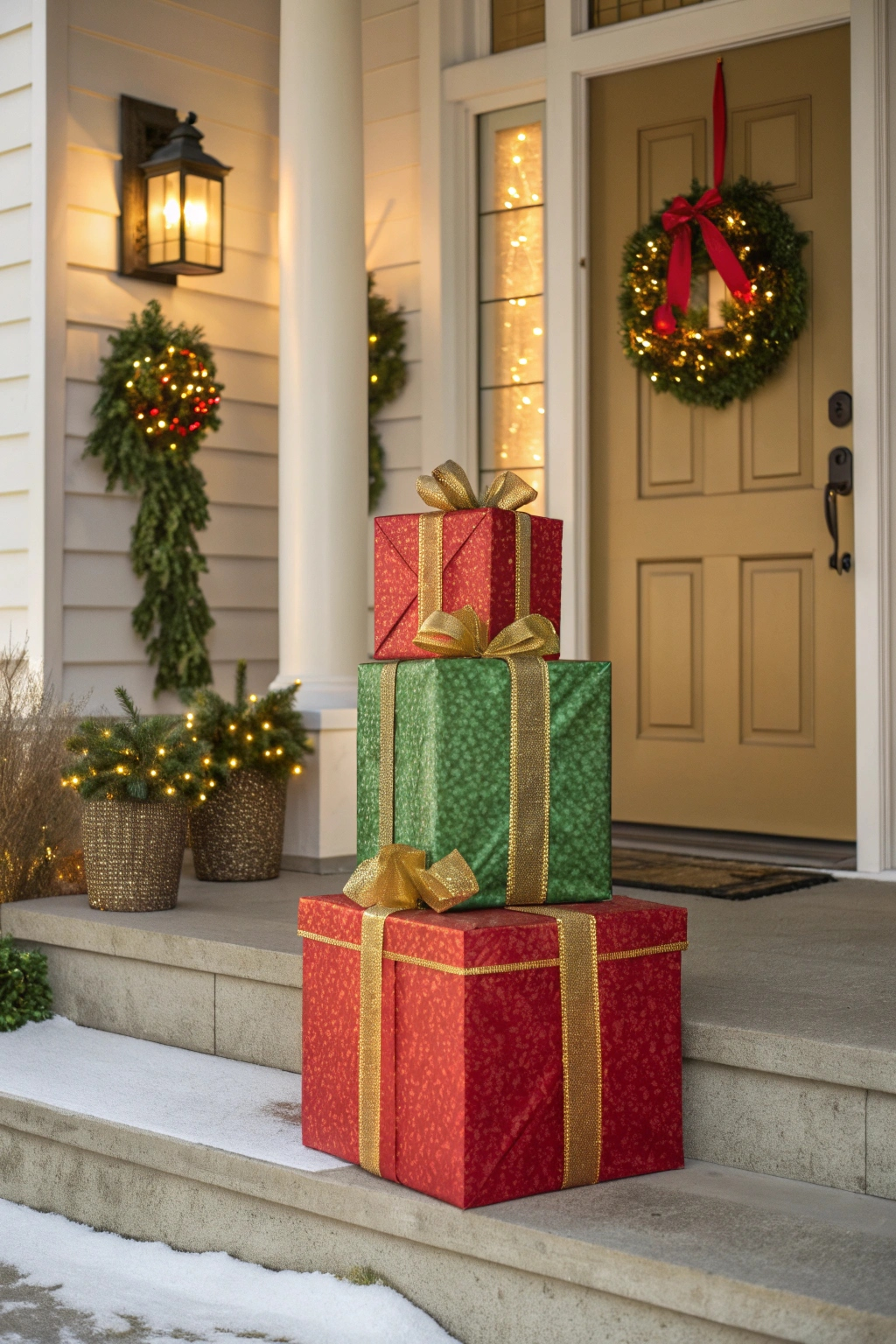 Complement your wreath with verdant garlands to amplify the holiday cheer. Choose from traditional pine, glittering metallic strands, or vibrant hues that coordinate with your overall theme. Drape garlands along railings, door frames, or across the porch ceiling. Embellish with festive touches like berries, ornaments, or twinkling lights to craft a magical winter scene.