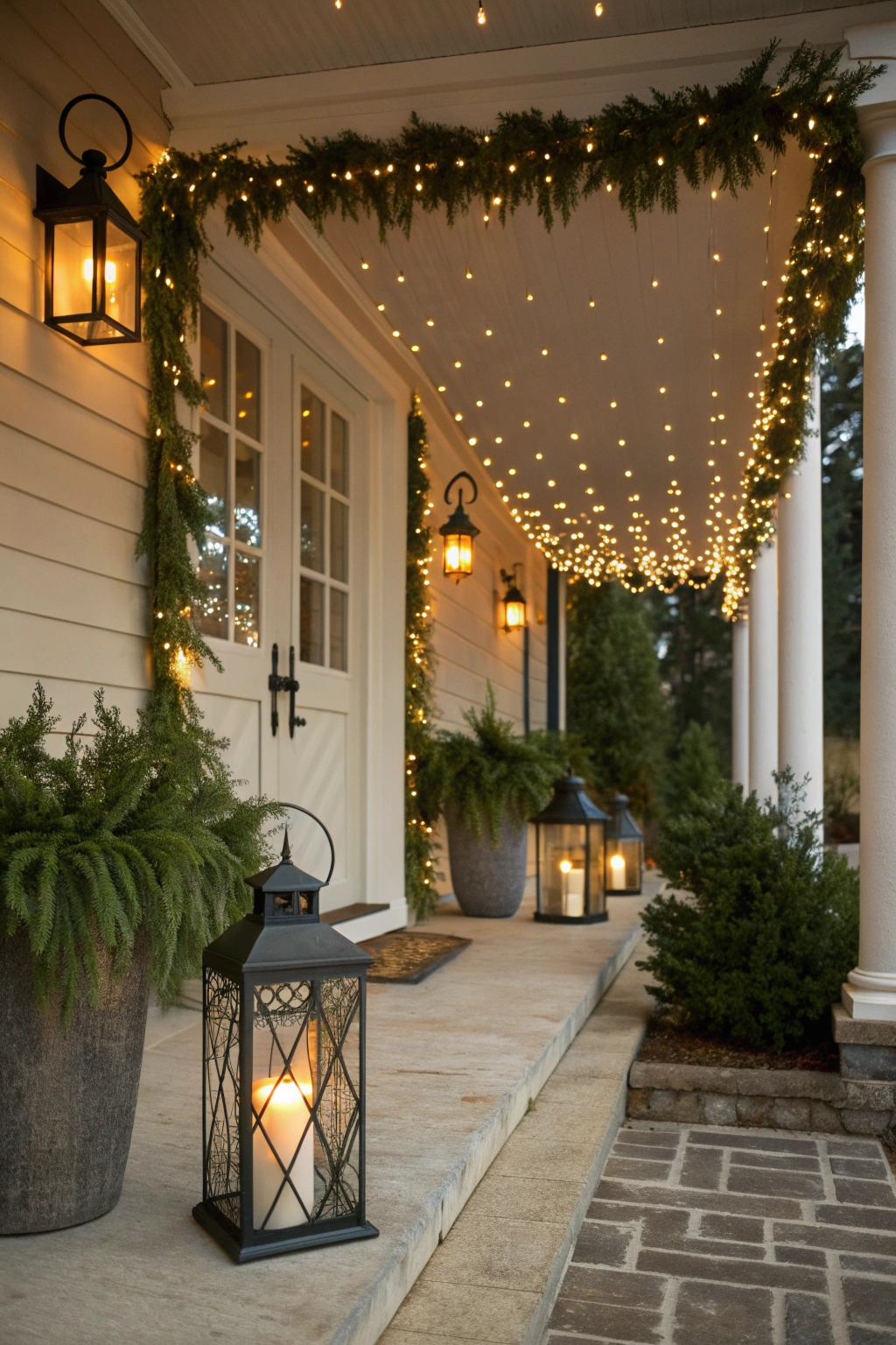 Ornamental lanterns add a sophisticated glow that complements string lights beautifully. Select lanterns in traditional holiday colors or rustic finishes to enhance your porch’s charm. Place them along pathways or suspend them from hooks for visual interest. Fill with LED candles or seasonal greenery to evoke a cozy, festive vibe.