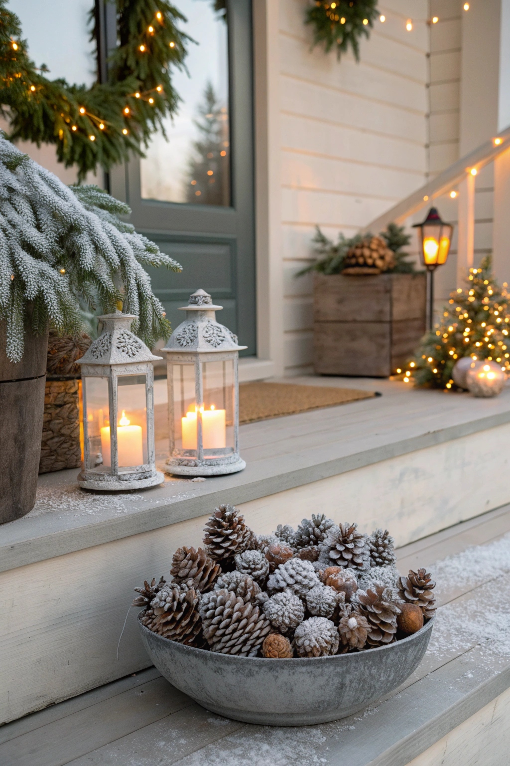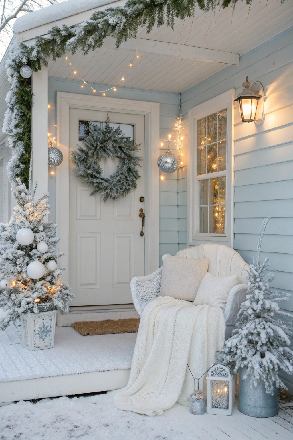 Incorporate snowy white elements to evoke a serene winter wonderland. Use white fairy lights, frosted pine branches, and shimmering silver ornaments to brighten your porch. A white wreath with silver highlights on your door adds a crisp, elegant touch. Even a simple white throw over your seating can enhance the cozy, wintry feel.