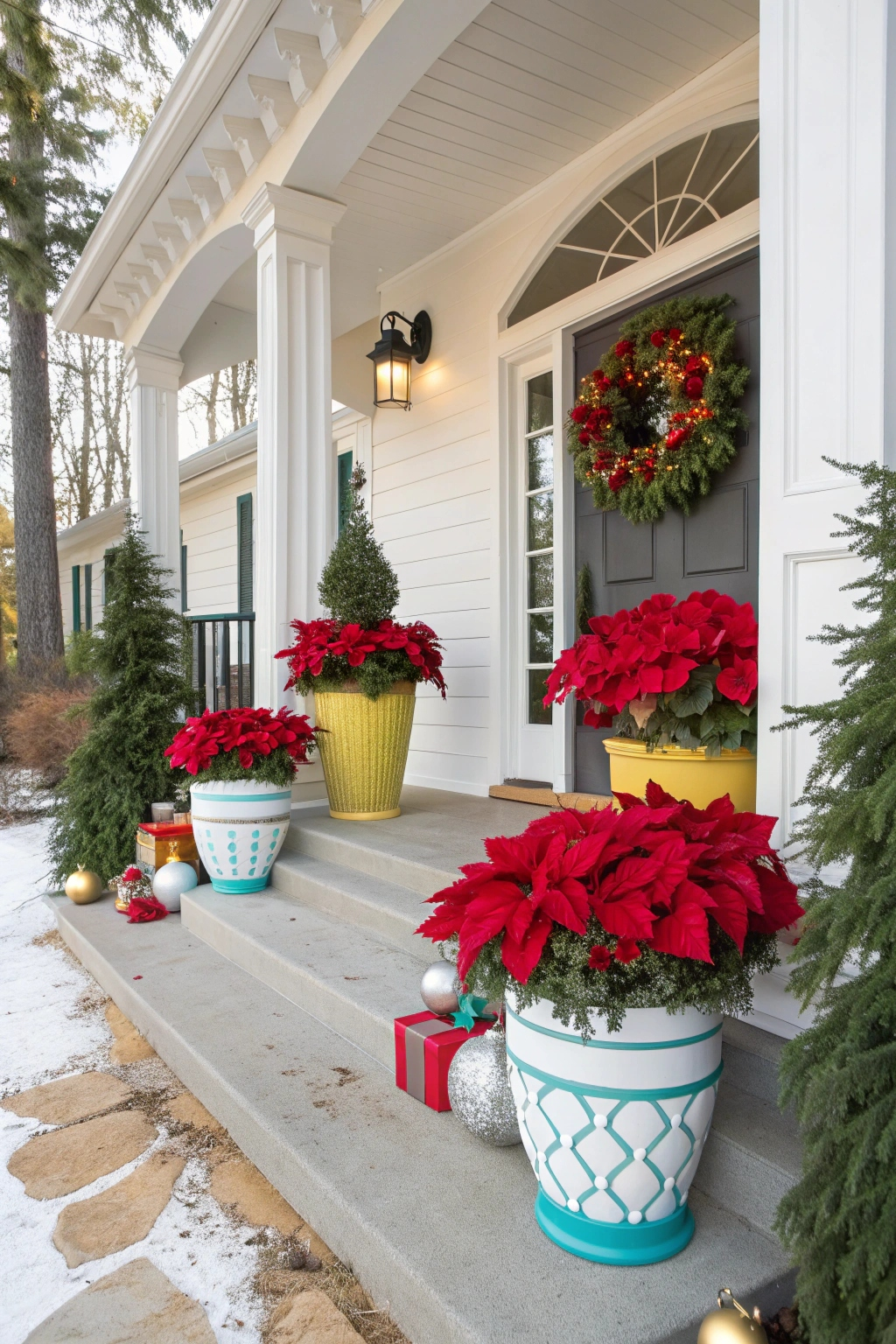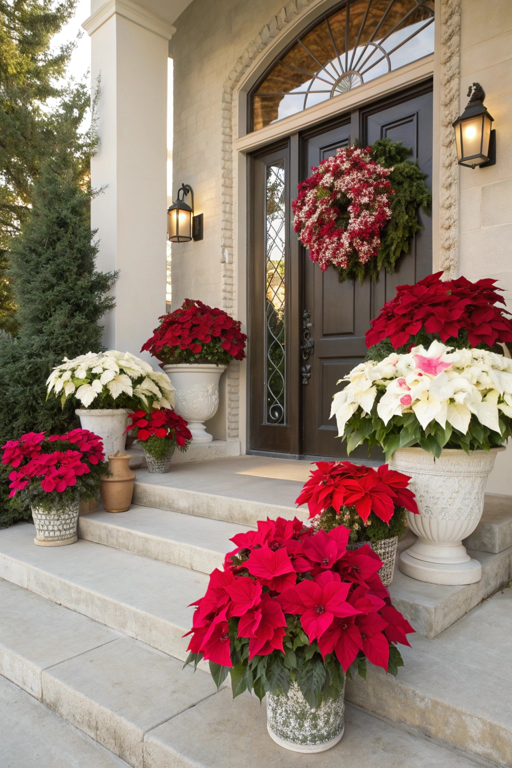 Brighten your porch with stunning poinsettia arrangements. For a dynamic display: