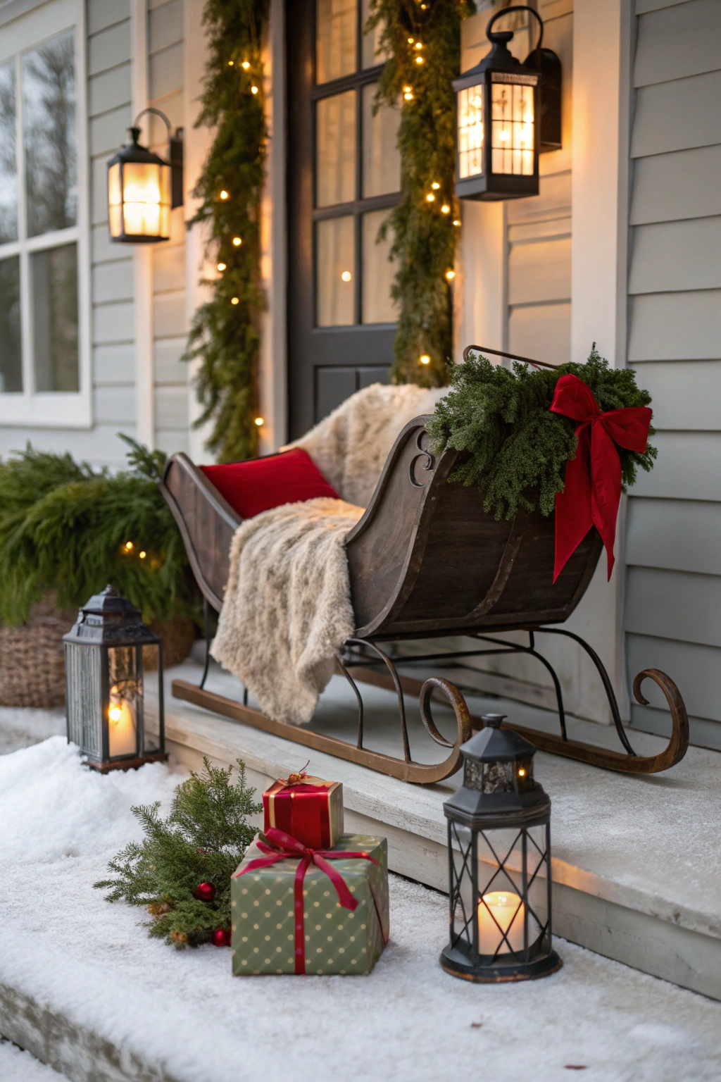 - A classic sleigh as the focal point.