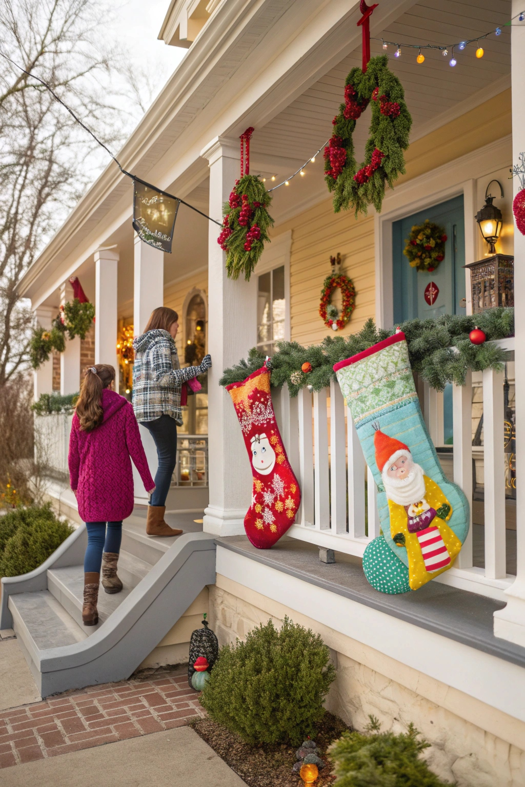 Inject fun and whimsy with oversized, colorful stockings featuring festive patterns or characters. Hang them from railings or decorative hooks to create a joyful display that delights visitors. Mixing textures and colors adds visual interest and enhances the welcoming holiday vibe.