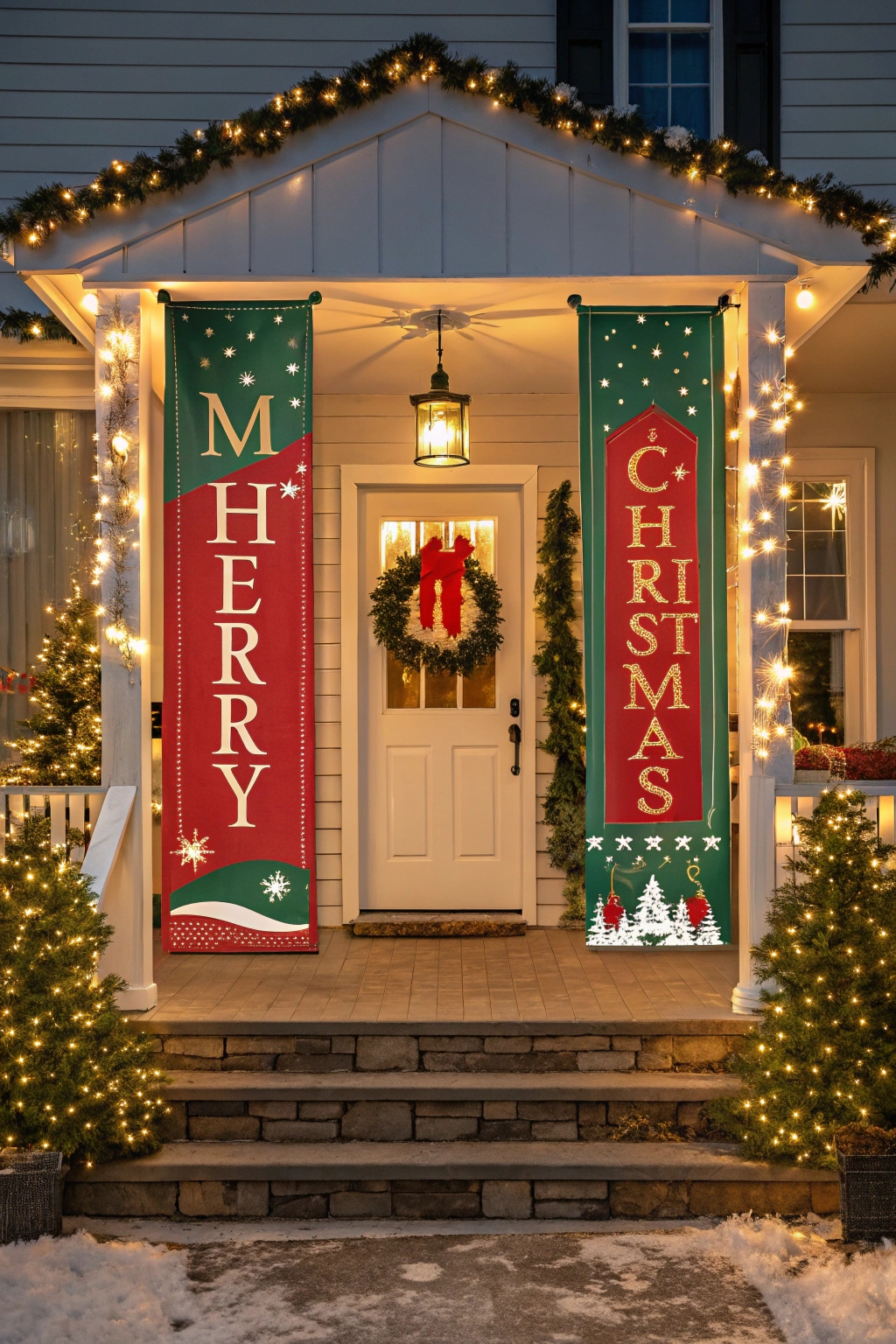 Brighten your porch with a festive “Merry Christmas” banner. For best results: