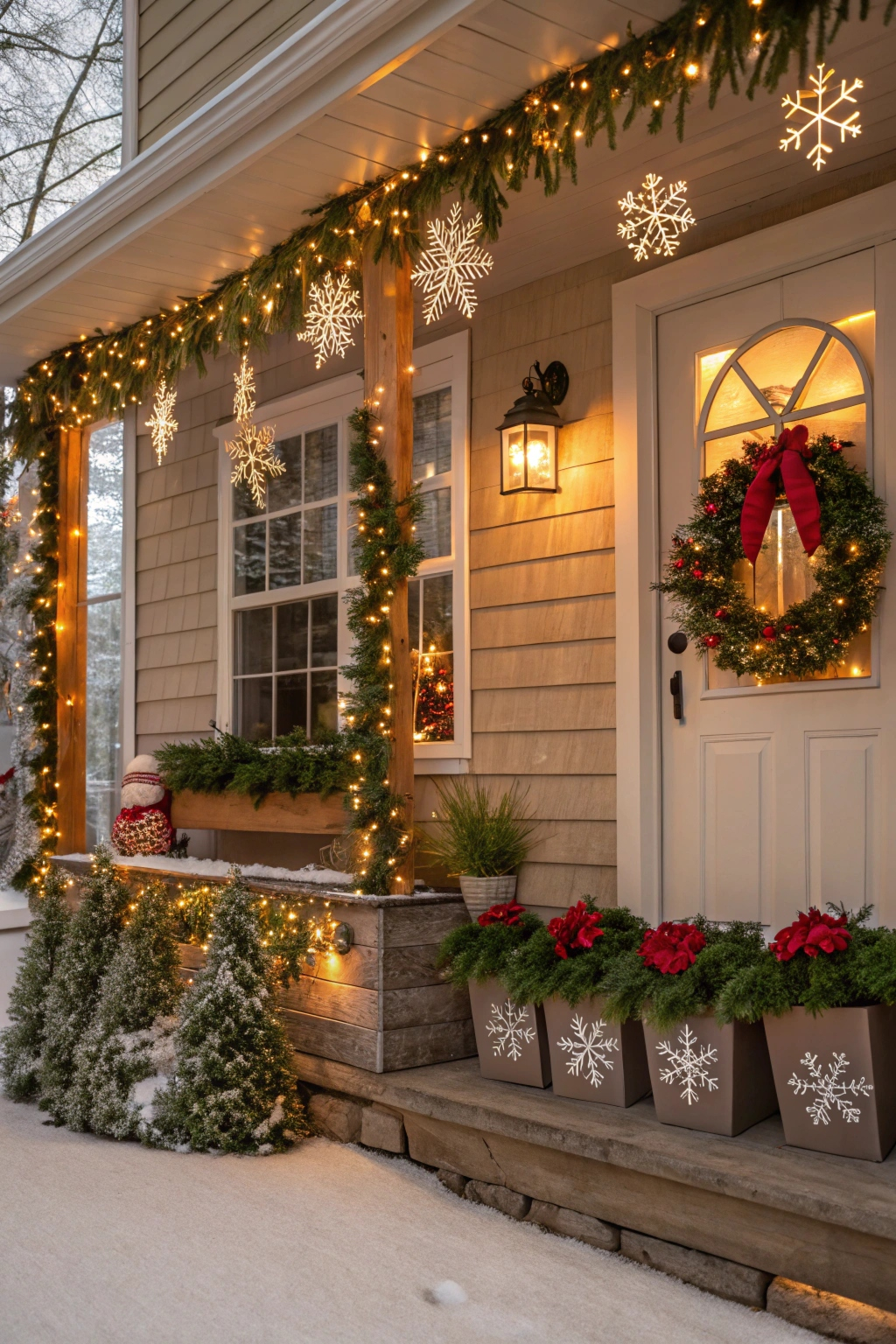 Enhance your porch’s holiday spirit with charming window décor. Hang garlands adorned with lights and ribbons, or install window boxes filled with evergreen branches, pinecones, and bright ornaments. Window clings featuring snowflakes or festive characters add a whimsical touch. These details create a warm, inviting atmosphere visible from both inside and outside your home.