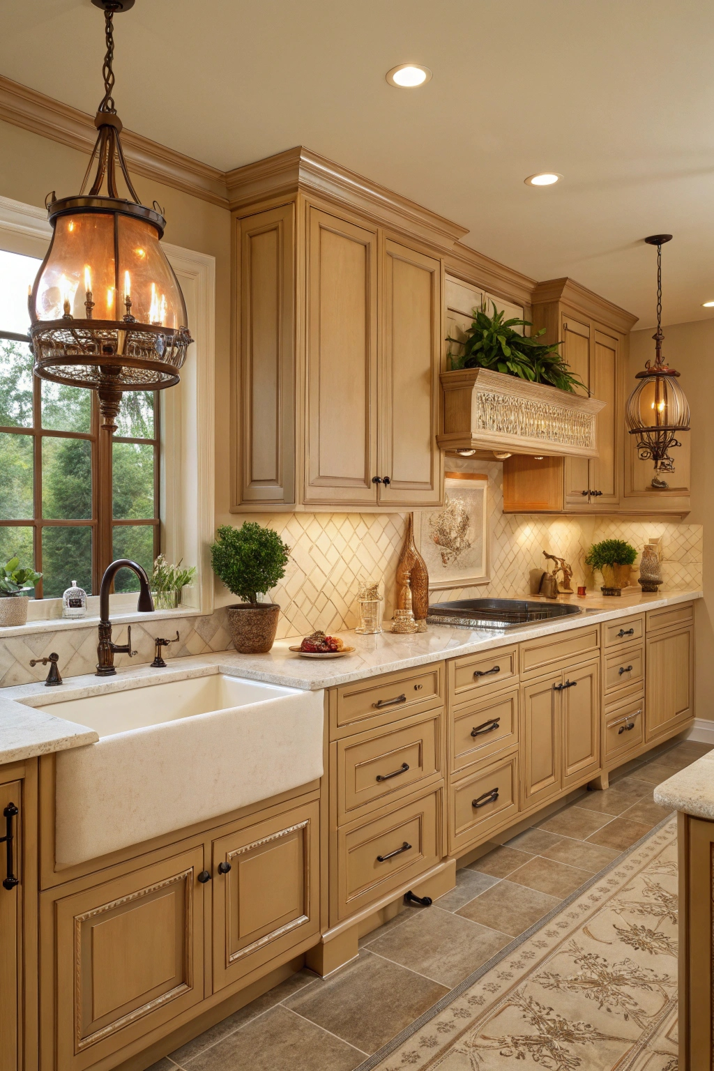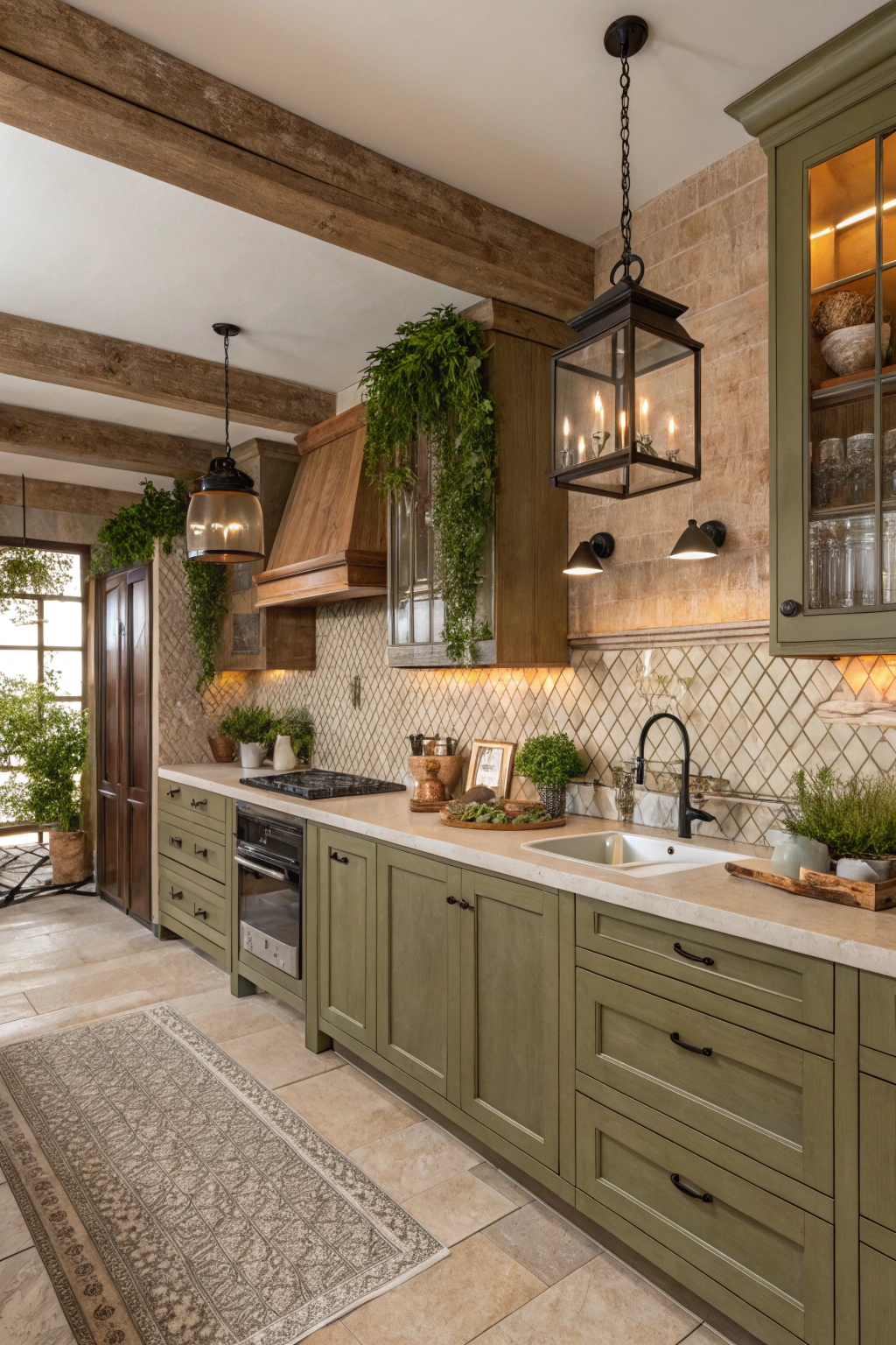Rustic olive cabinets bring an inviting earthiness that pairs well with vintage wood accents and neutral countertops. Textured backsplash tiles and lush plants add freshness, while warm pendant lighting enhances the cozy ambiance. This color creates a welcoming sanctuary ideal for both cooking and socializing.