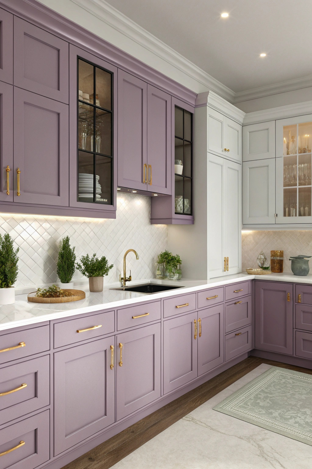 Gentle lavender introduces a subtle yet uplifting charm to your kitchen. This delicate shade brightens the space without overpowering it, especially when paired with white countertops and gold hardware. Adding greenery and mixing in darker cabinetry can create a balanced and elegant look, enhanced further by soft lighting.