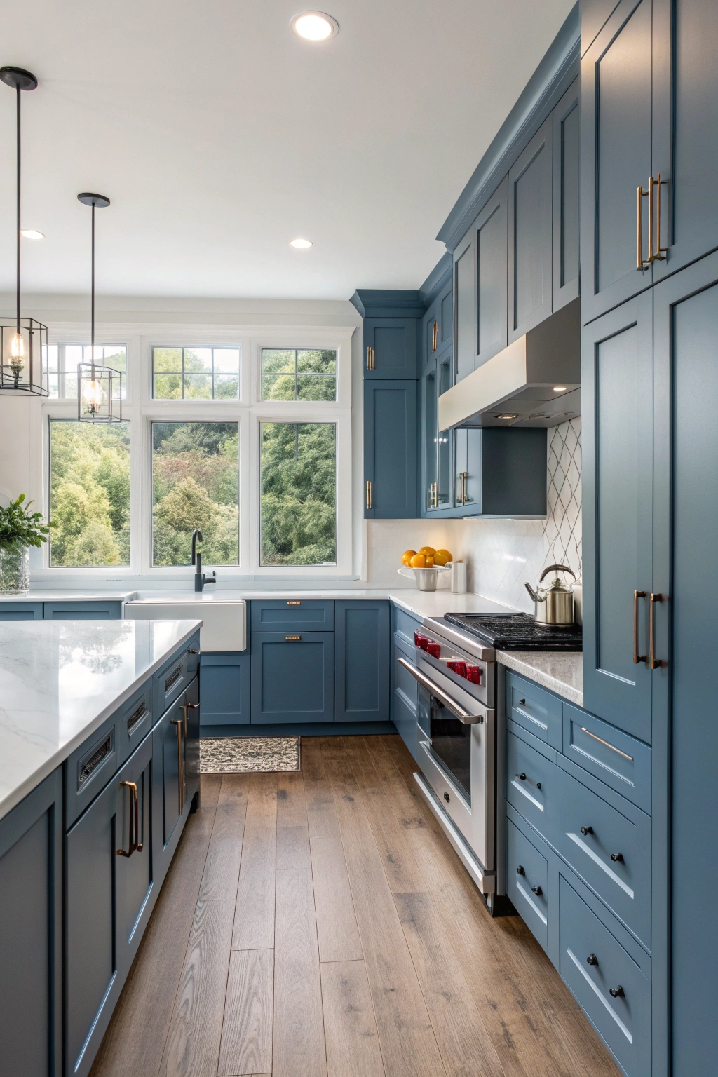 Modern steel blue cabinets offer a cool, sophisticated tone that complements stainless steel appliances and enhances natural light. This versatile color suits both contemporary and traditional kitchens, providing a tranquil and polished atmosphere.
