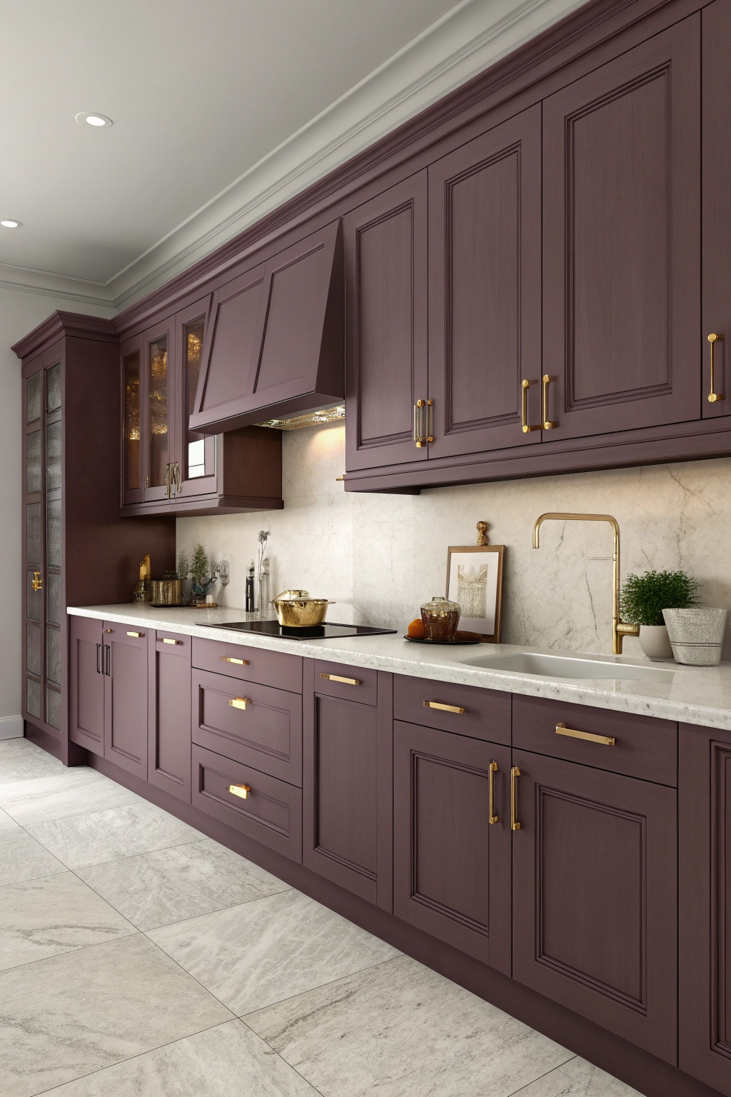 Smoky plum offers a luxurious blend of warmth and depth, perfect for adding a touch of elegance to your kitchen. Pair this rich shade with gold or brass hardware and lighter countertops to maintain balance. Plum cabinetry creates a cozy yet stylish atmosphere that elevates your culinary space.