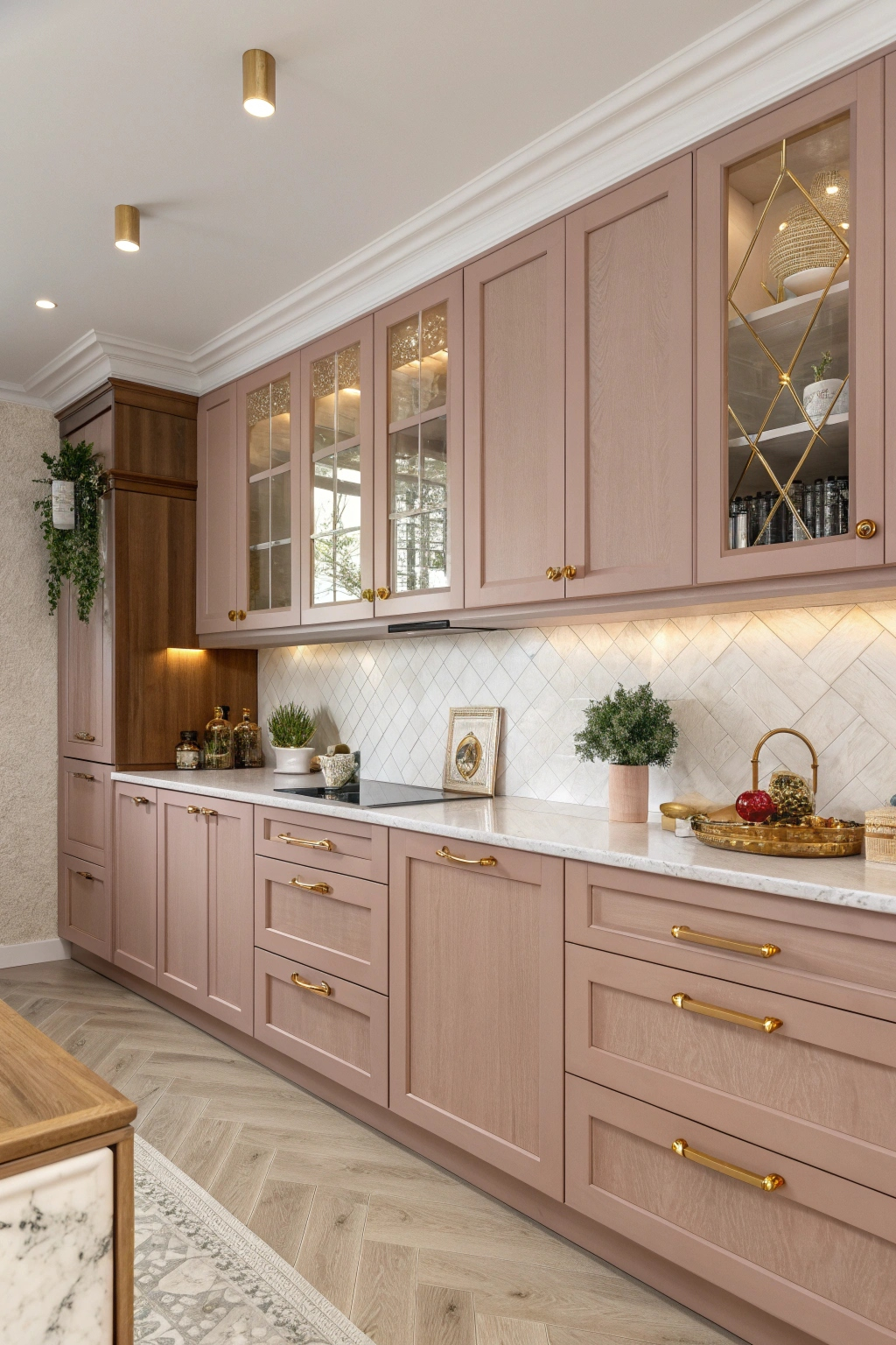 Dusty rose cabinets add a subtle elegance and warmth, transforming your kitchen into a cozy retreat. This muted pink shade pairs beautifully with neutral tones and natural wood, while gold hardware and botanical decor enhance its inviting charm. It’s a perfect choice for those seeking a unique yet understated look.