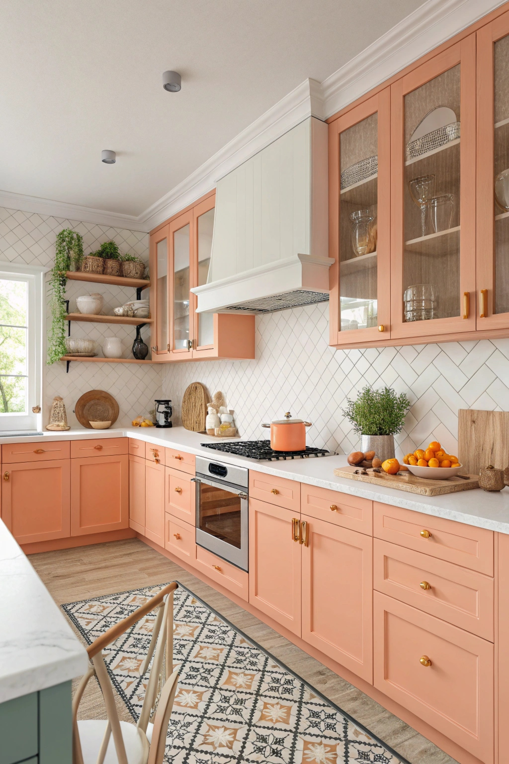 Playful peach cabinets add a warm, cheerful vibe that brightens your kitchen and creates a welcoming atmosphere. This hue pairs beautifully with white or light wood accents, effortlessly transforming your cooking space into a lively and fresh environment.