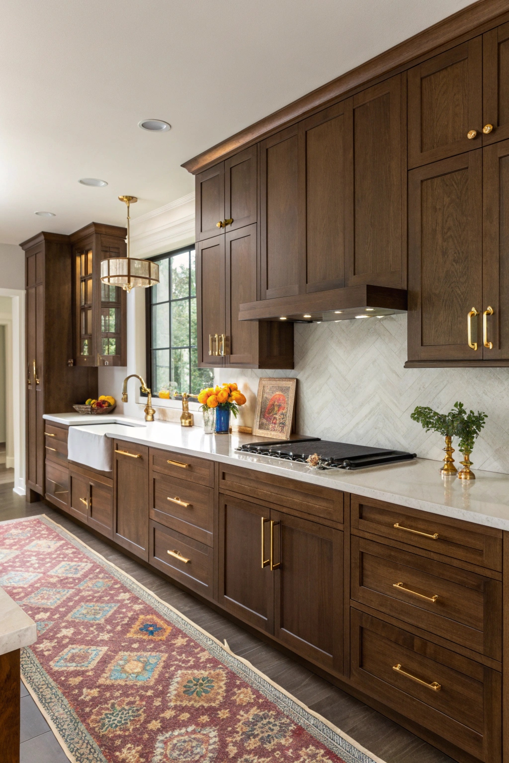 Elegant dark walnut cabinets exude warmth and sophistication, making them a stunning centerpiece. Pair with lighter countertops for contrast, add brass or gold hardware for a modern touch, and incorporate natural wood accents and soft lighting to complete the look. This rich color transforms your kitchen into a luxurious retreat.
