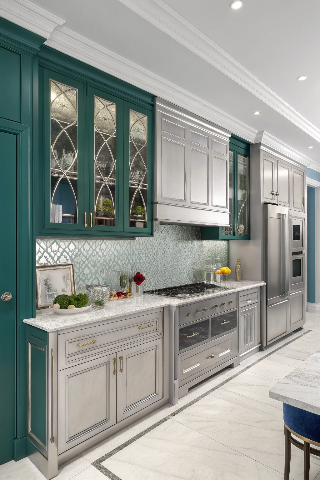 Shimmering silver cabinetry adds a touch of luxury and sophistication, reflecting light to brighten your kitchen. This elegant color complements both modern and traditional designs, pairs well with bold accents, and is practical for hiding fingerprints and smudges. Silver cabinets bring a glamorous edge to your culinary space.