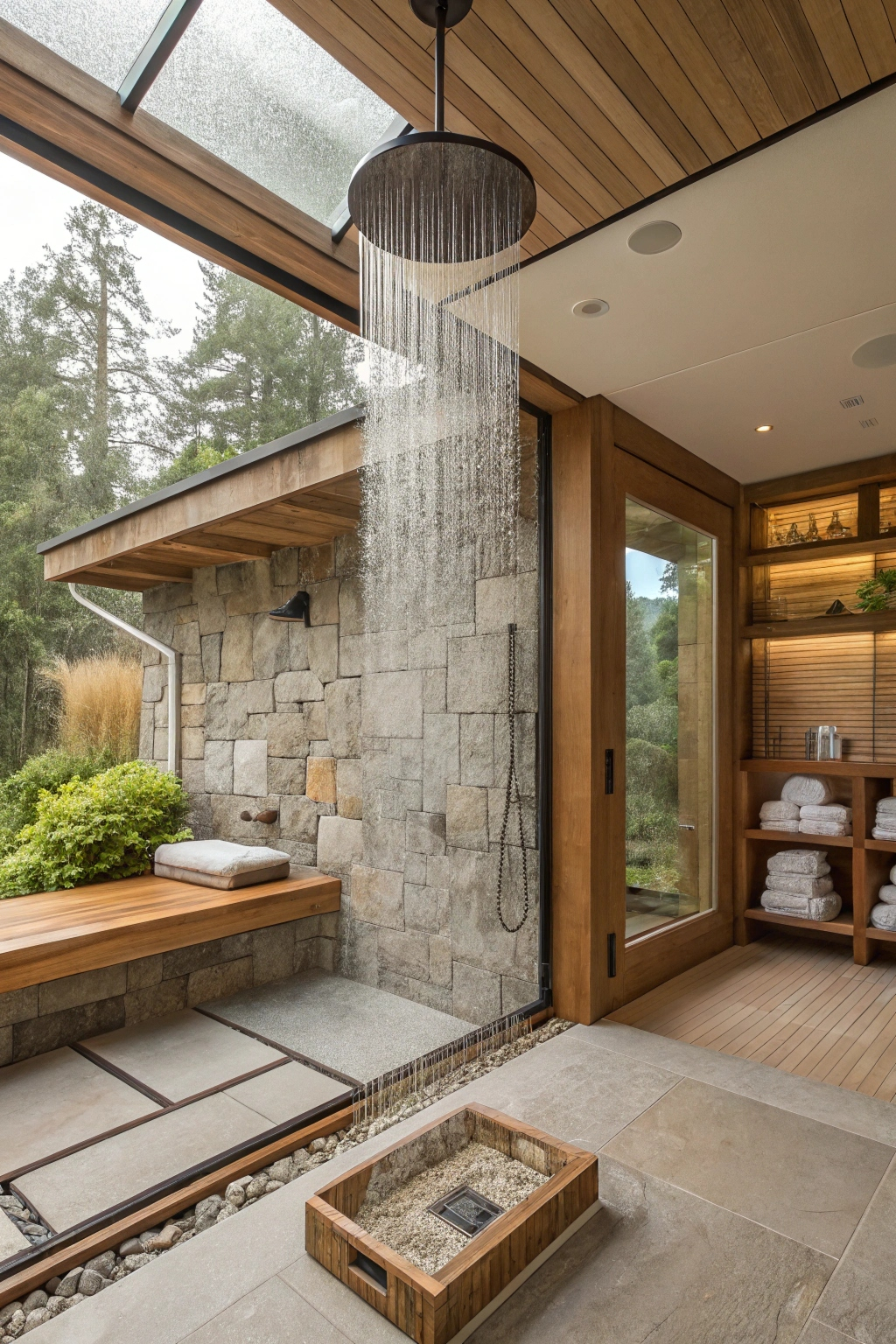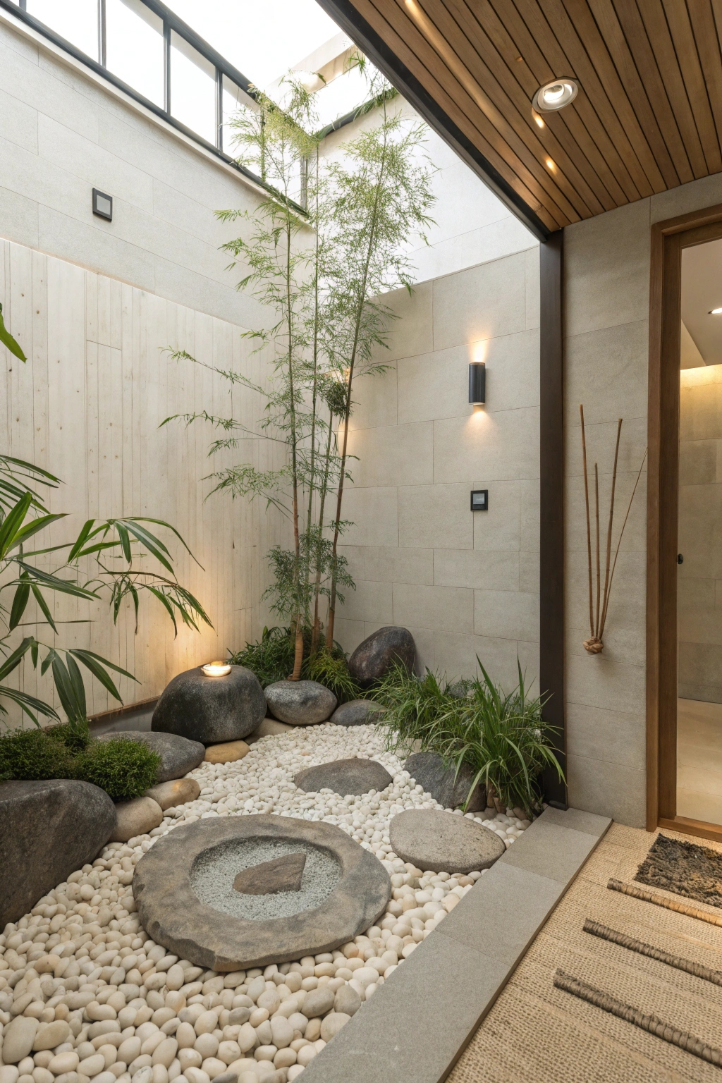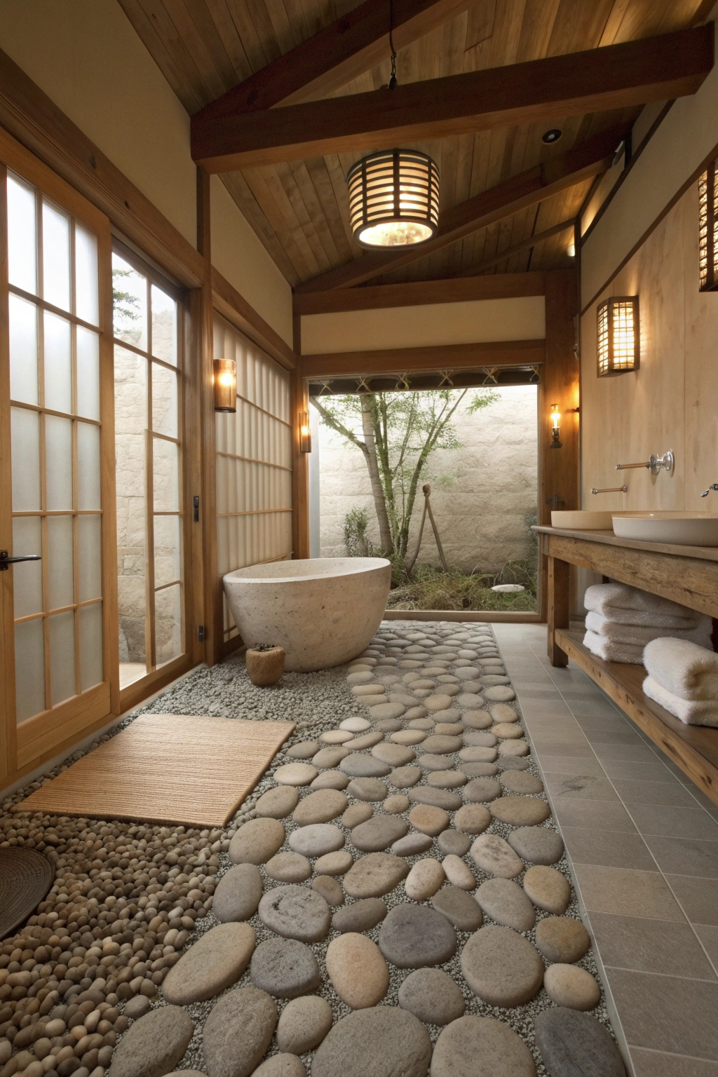 Pebble stone flooring introduces a tactile and visual element reminiscent of a peaceful riverbed. Its natural texture offers a gentle foot massage with every step, enhancing comfort. This flooring option is durable, easy to maintain, and adds an organic charm that complements the spa atmosphere.