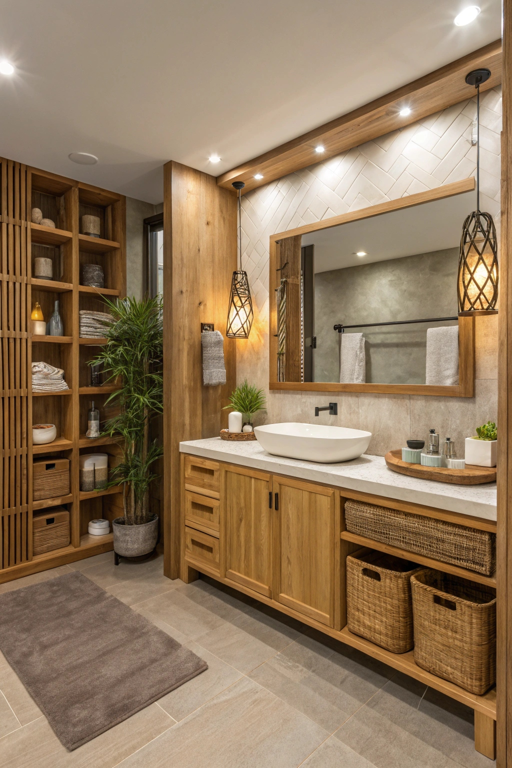 Enhance your bathroom’s tranquility by integrating Zen garden elements. A miniature rock garden with smooth stones and raked sand offers a meditative focal point. Adding bamboo plants and a small tabletop water fountain can further evoke a sense of peace and connection to nature, creating a calming retreat within your home.