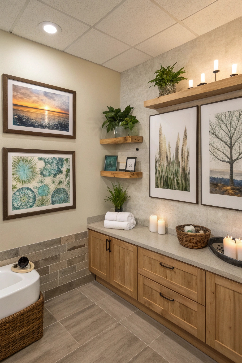 Enhance your spa bathroom’s ambiance with thoughtfully selected wall art and decor. Opt for serene themes such as botanical prints or abstract landscapes to foster tranquility. Position framed artwork at eye level for maximum impact. Incorporate wooden shelves or stylish hooks to display decorative items like candles and small plants, blending aesthetics with practicality.