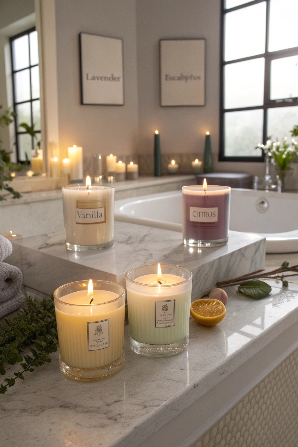 Candles are a timeless way to enrich your spa bathroom’s ambiance with soft lighting and inviting scents. Consider these fragrance options to tailor your mood: