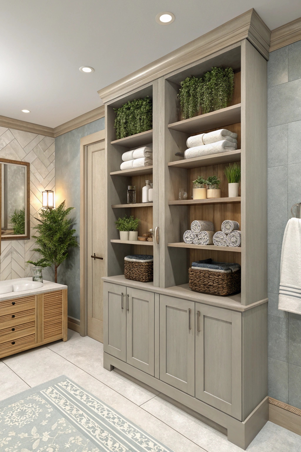Custom shelving can boost both the practicality and style of your spa bathroom. Design open shelves to showcase towels and plants, or opt for closed cabinetry to maintain a sleek look. Well-planned shelving keeps your essentials organized and enhances the overall peaceful vibe of your space.