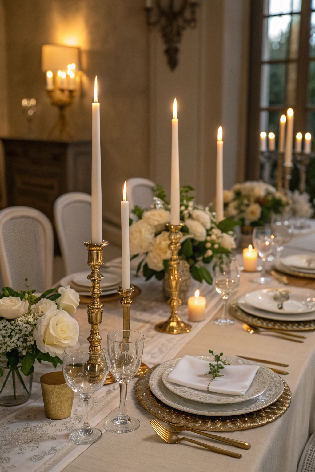 Drape a gold table runner or scatter gold votive candles for warmth. Gold napkin rings and delicate glassware with gold trim provide a polished, luxurious finish.