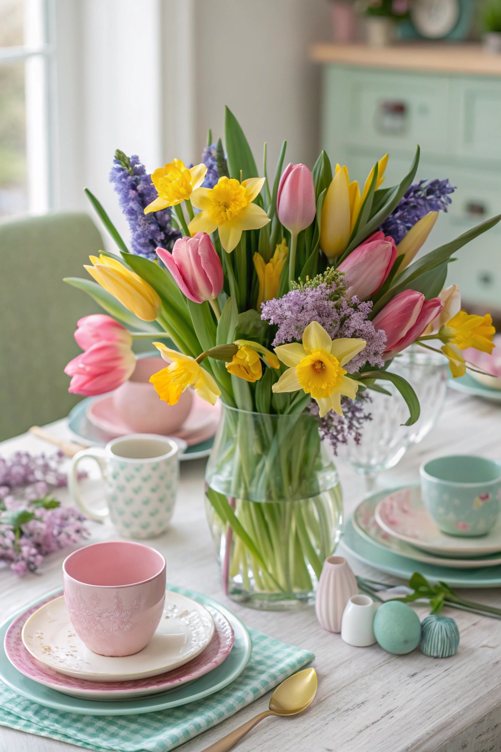 Complement the blooms with pastel-colored dinnerware to enhance the seasonal feel.