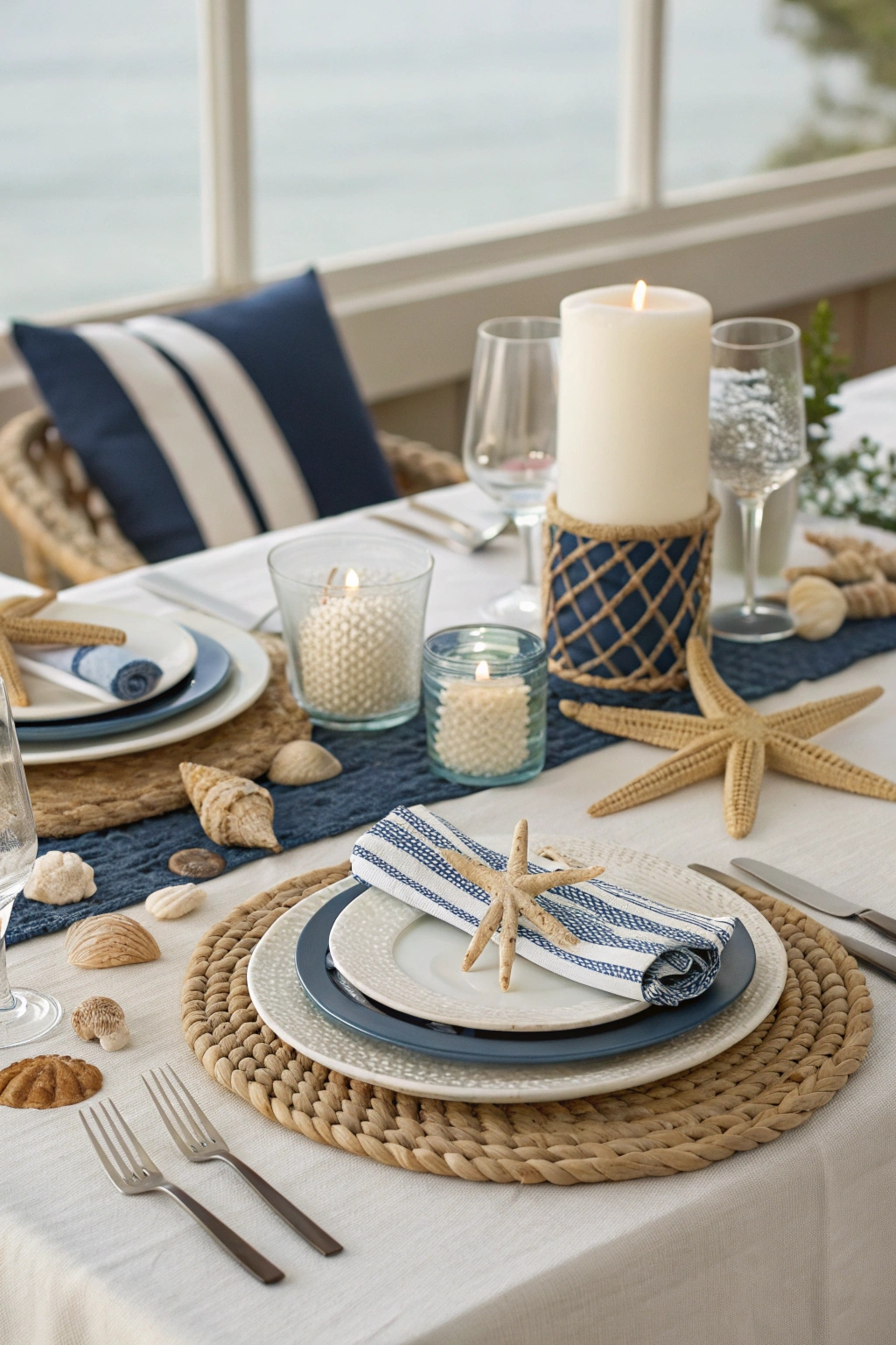 - Decorate with seashells and rope-adorned candle holders for a nautical-inspired tablescape.