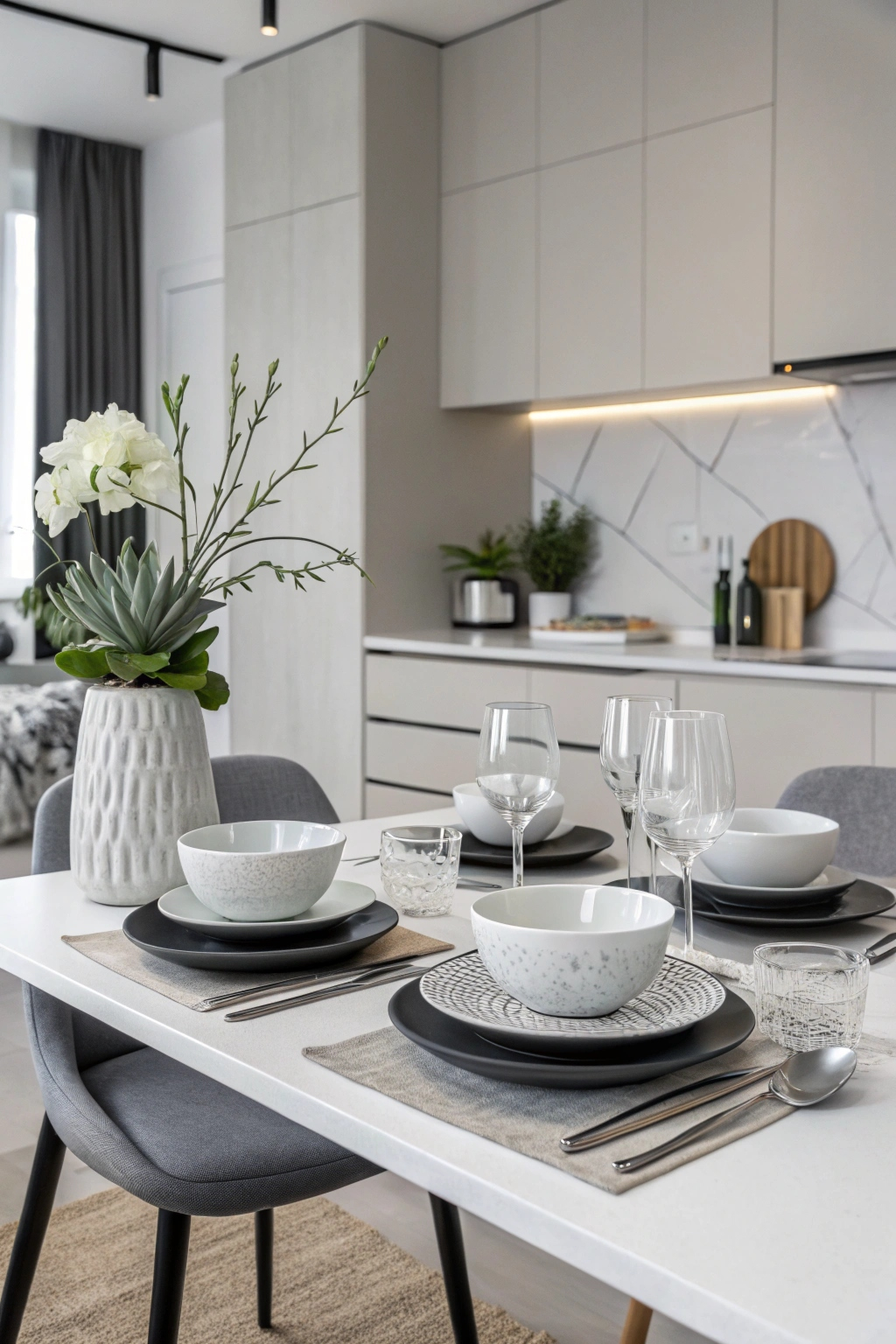 Choose streamlined tableware and glassware that highlight simplicity. Add a single green element, such as a succulent or a white flower in a minimalist vase, to bring life without clutter.