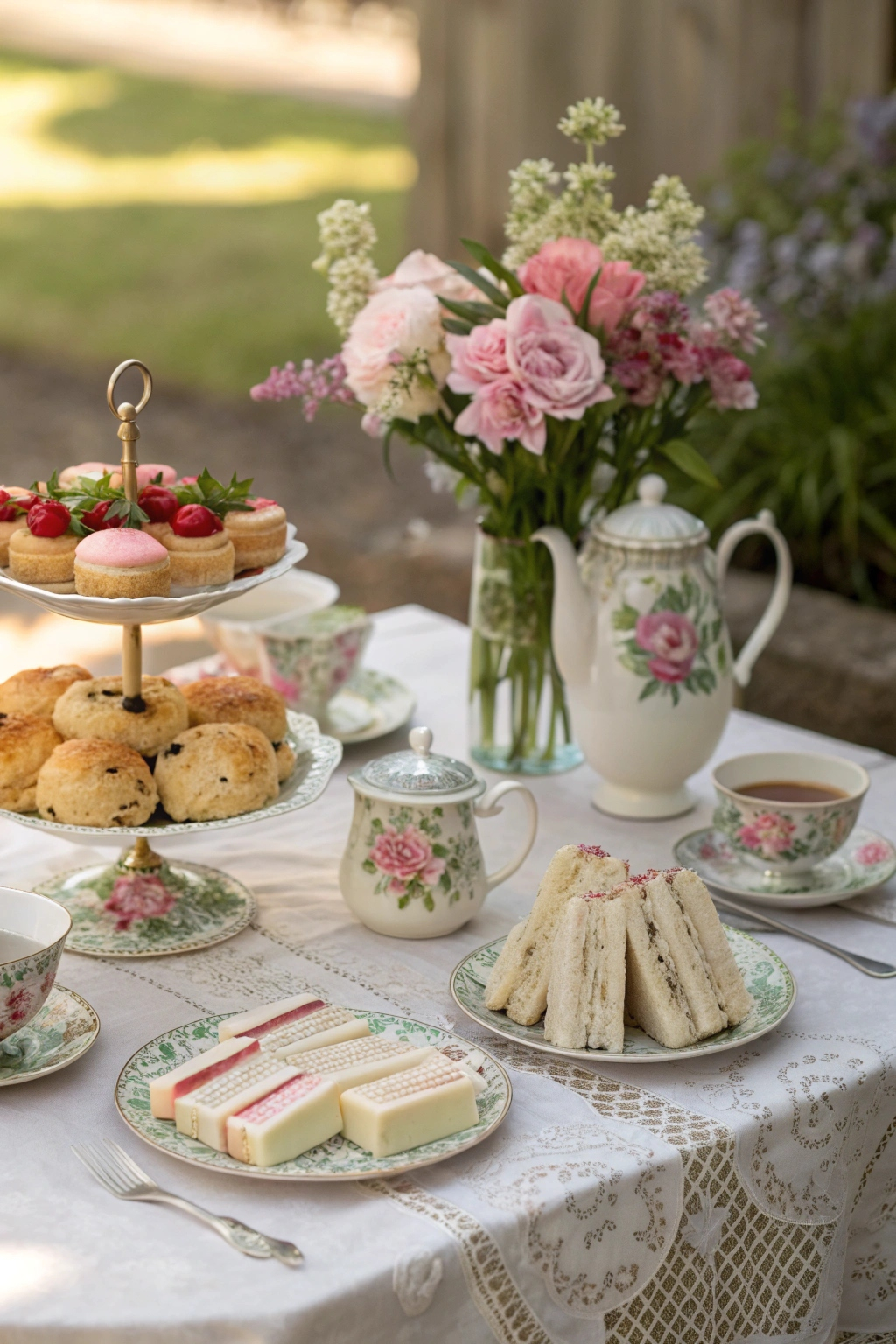 Complete the scene with tiered trays showcasing scones and finger sandwiches, perfect for an elegant afternoon gathering.