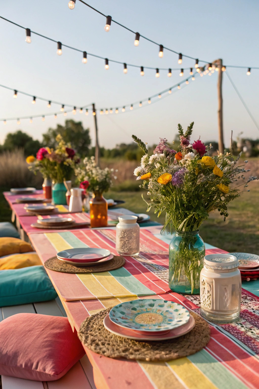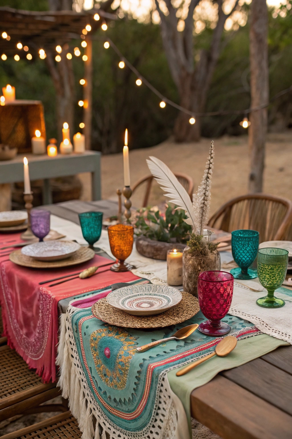 Incorporate macramé placemats and colorful glassware to enhance the boho vibe.