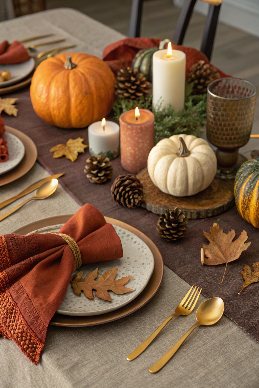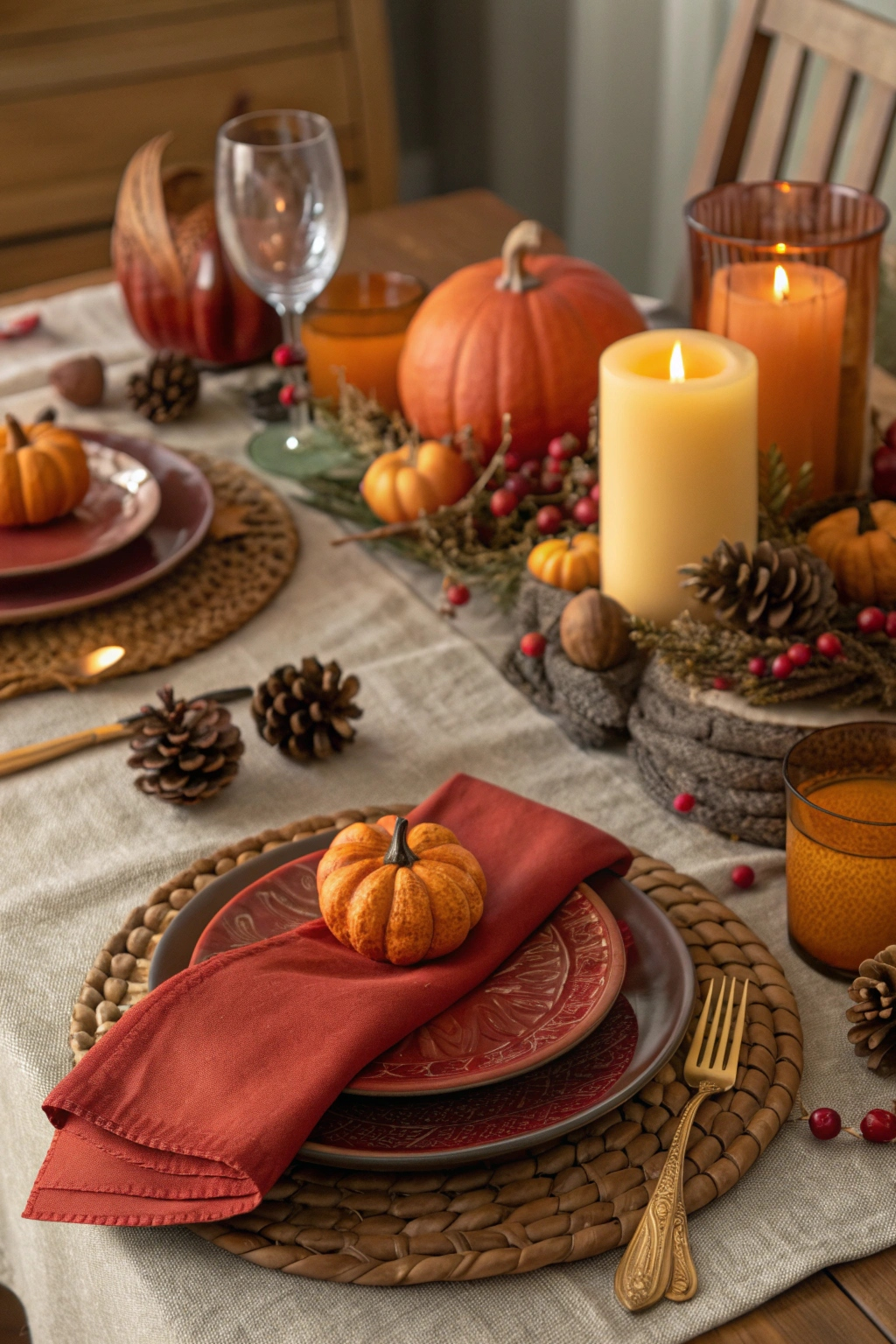 Centerpieces featuring pumpkins, gourds, and rustic candles set a welcoming tone. Use warm-hued napkins and golden cutlery to enhance the inviting feel.