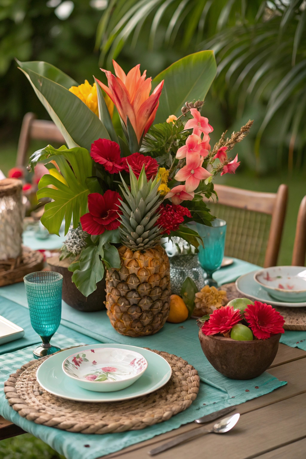 Incorporate palm fronds and banana leaves for authenticity. Choose bright dinnerware in turquoise and coral shades.