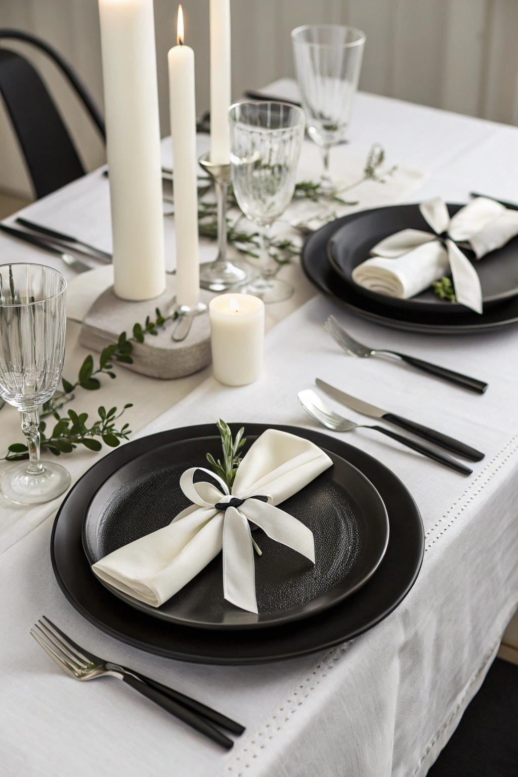Black napkins tied with white ribbons add a refined touch, while white candles in black holders and a simple monochrome centerpiece complete the ensemble.