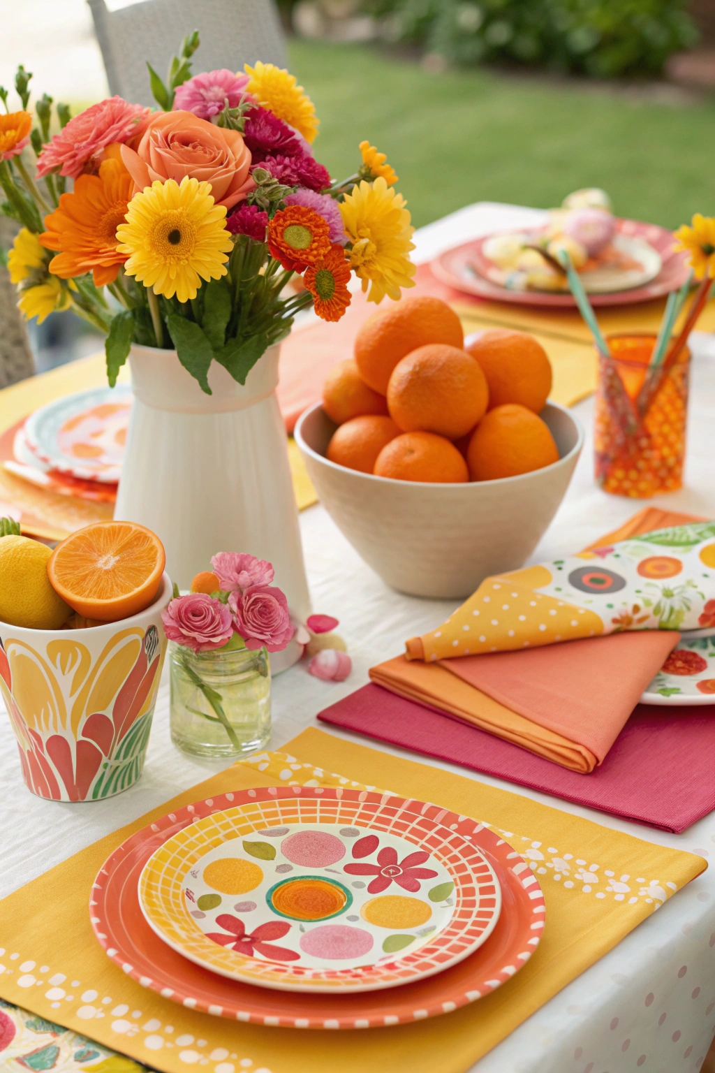 Inject your table with a burst of summer energy using bright, sunny colors like orange, yellow, and pink. Fresh flowers, vibrant napkins, and graphic plates add to the lively atmosphere.
