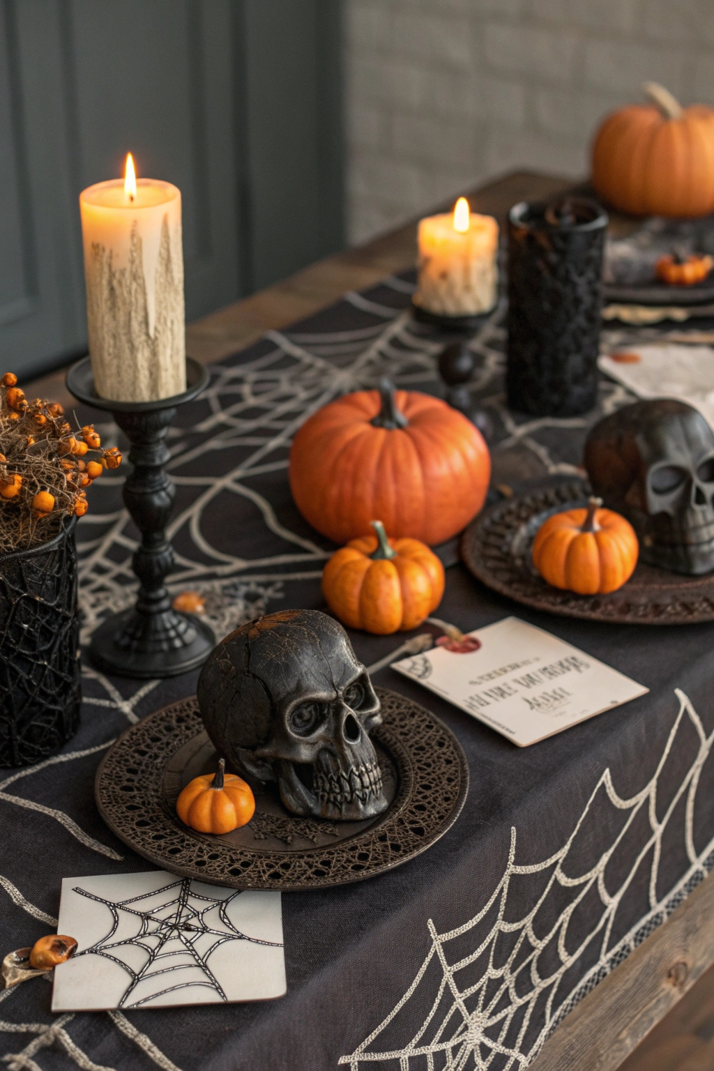 Scatter faux cobwebs and miniature pumpkins across the table. Dark candles in skull-shaped holders provide a haunting glow.