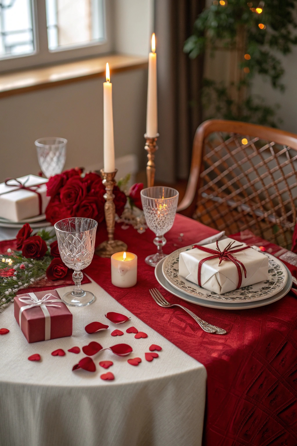 Create a romantic ambiance with a table dressed in red or pink linens. Scatter rose petals across the surface for an elegant touch.