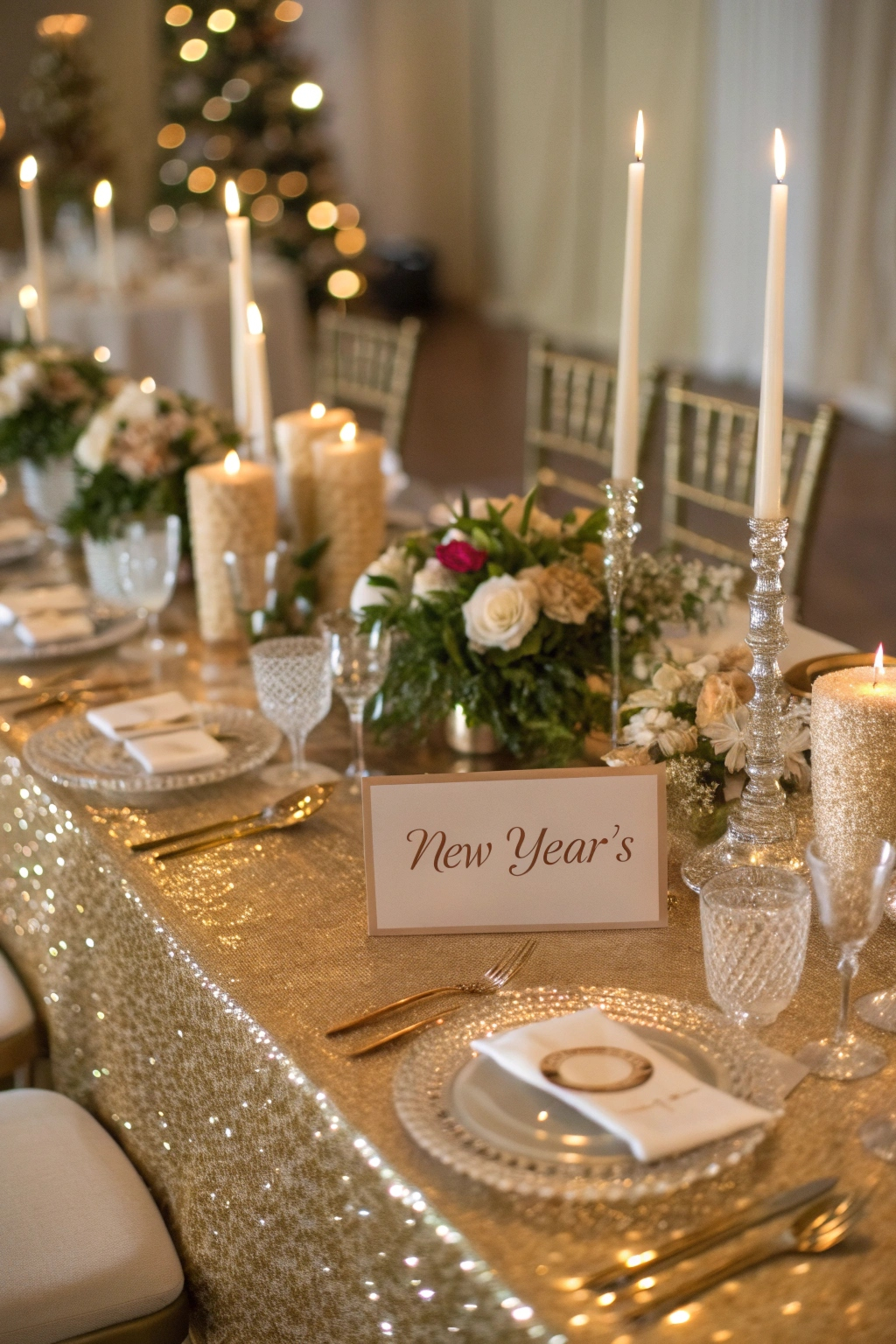 Glittering candles add sparkle, while chic centerpieces featuring lush blooms or crystal accents elevate the ambiance.