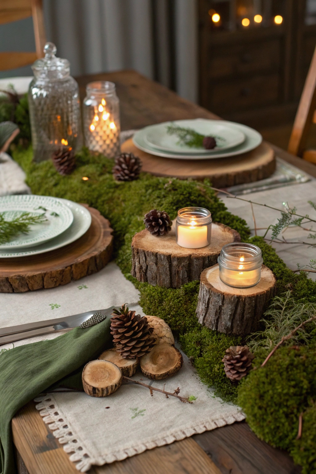 Use wood slices as placemats and moss as a lush table runner. Add pinecones and twigs for texture and interest.