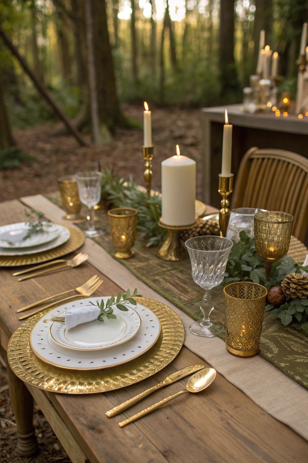 Complement the calming woodland vibe with opulent gold accents to add a layer of sophistication. Use gold-rimmed plates and glittering flatware to elevate the dining experience.