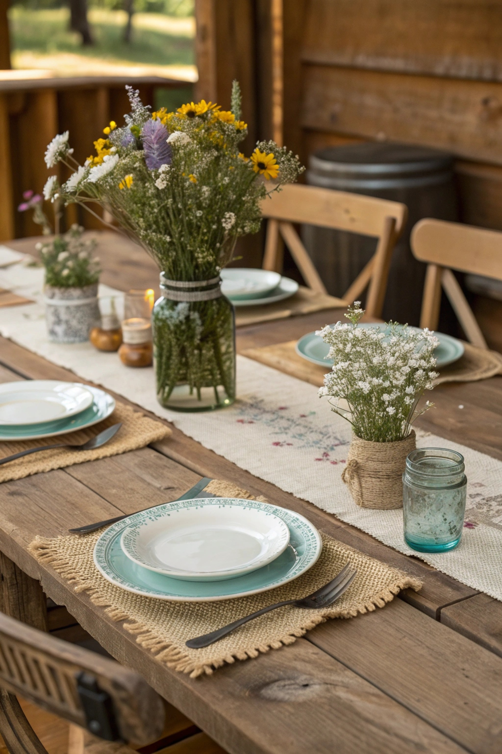 Centerpieces featuring mason jars brimming with wildflowers or bottles wrapped in twine bring a quaint, handcrafted feel. Complement the look with stoneware plates and an eclectic mix of flatware to enhance the inviting ambiance.
