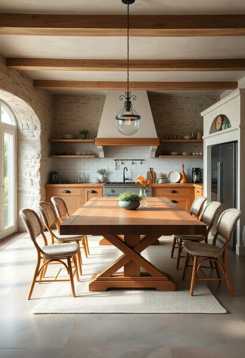 Rustic Table: Feature a large, wooden farmhouse table for family gatherings, enhancing the kitchen’s role as a hub for togetherness